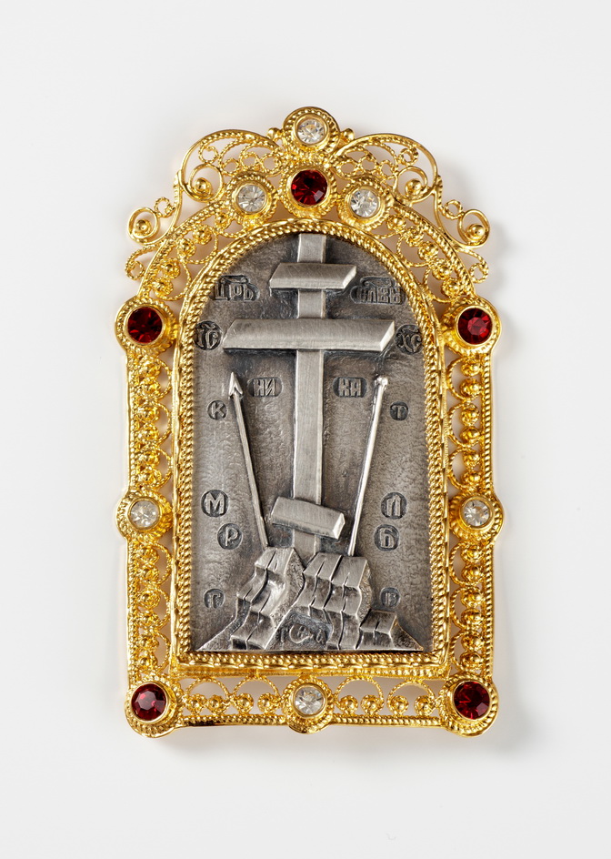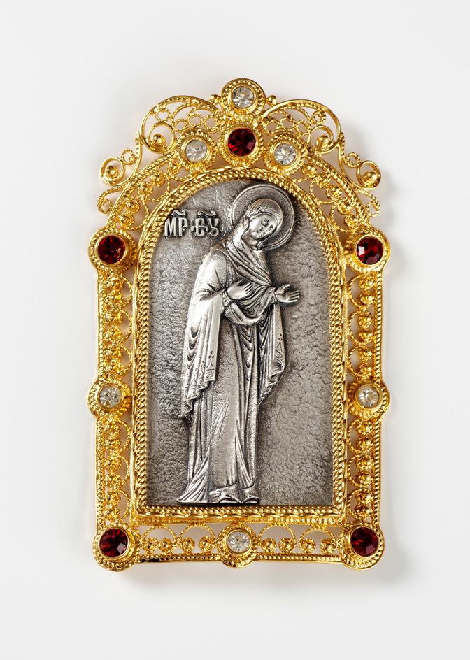 Цена указана за 1 икону. Необычный комплект икон для митры состоит из четырёх ростовых икон: Иисуса Христа, Богородицы, Иоанна Крестителя и Креста Господня. Объемные иконы, покрытые серебром и чернением, выполнены методом гальванопластики. Контрастная позолоченная кайма, состоящая из тонких металлических узоров, украшена белыми и красными объемными камнями. Изделия имеют размер 95х55х7 мм.
