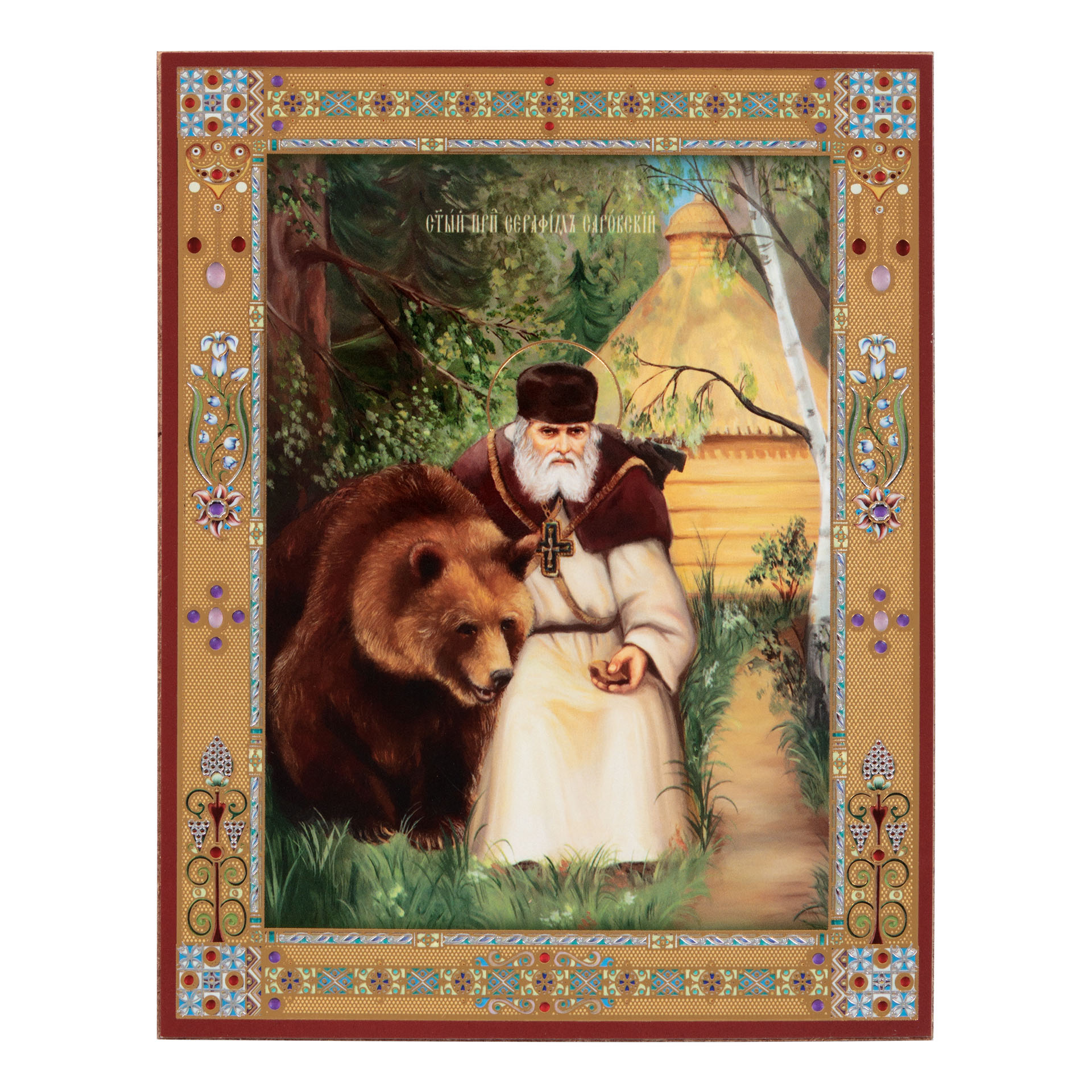 Икона на оргалите №1 11х13 двойное тиснение Серафим Саровский с медведем 3