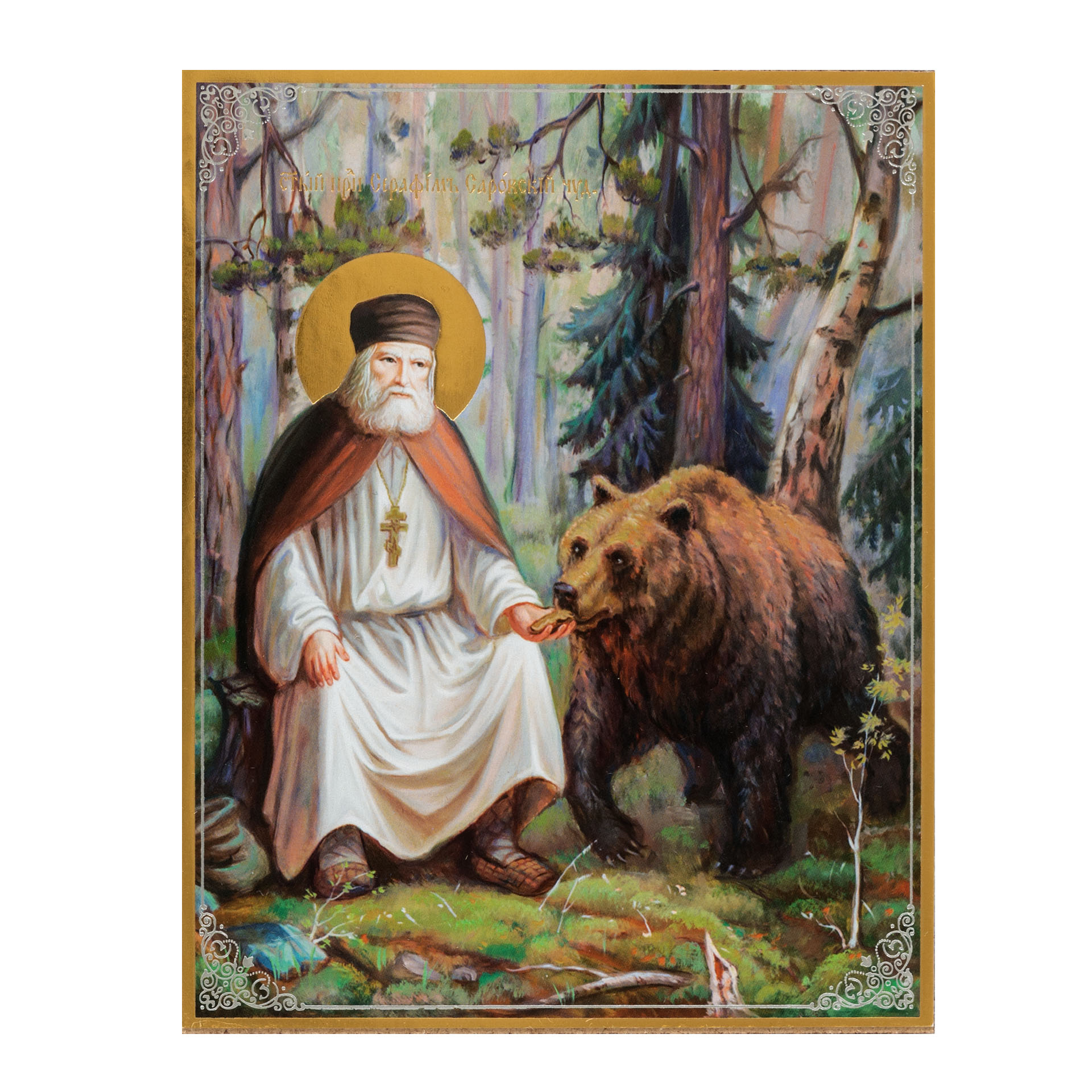 Икона на оргалите №1 11х13 двойное тиснение Серафим Саровский с медведем 4
