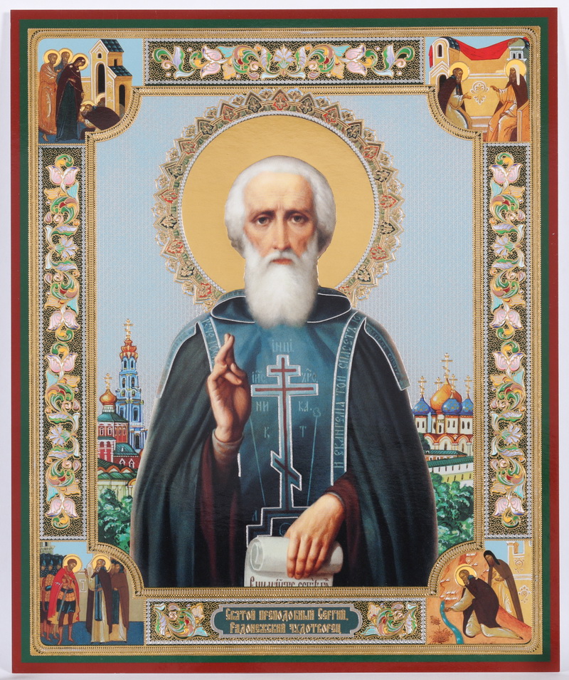 Икона на оргалите №1 18х24 двойное тиснение Сергий Радонежский (с клеймами)
