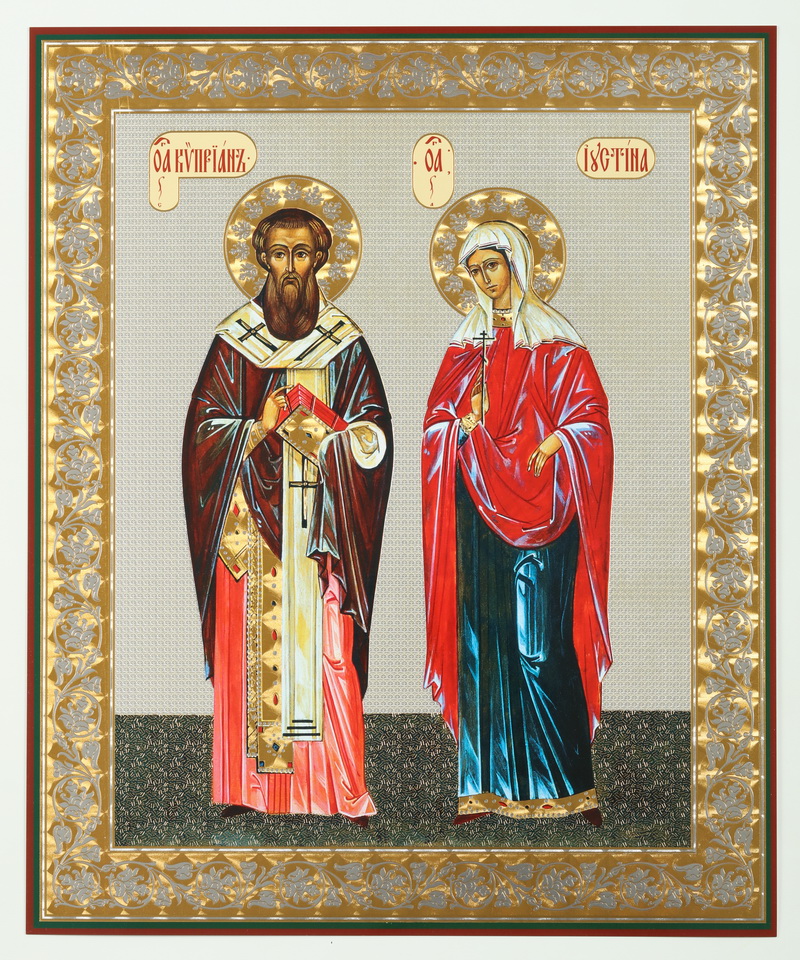 Икона на оргалите №1 30х40 двойное тиснение Киприан и Иустина