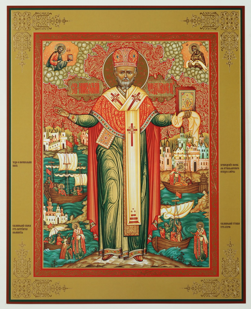 Икона на оргалите №1 30х40 двойное тиснение Николай Чудотворец с житием 01