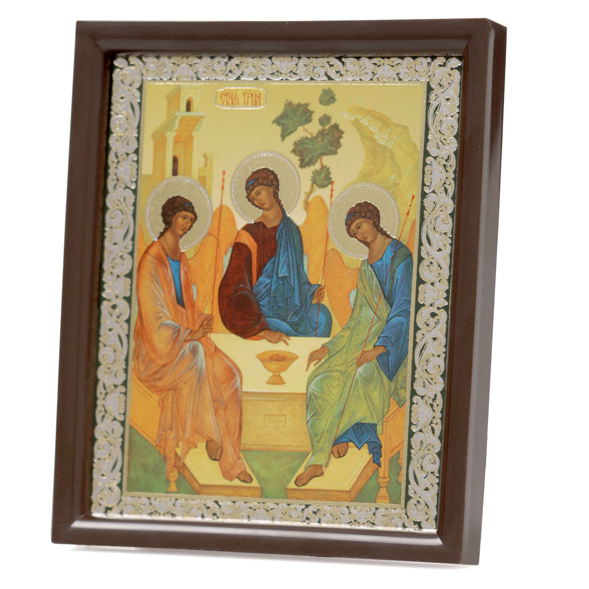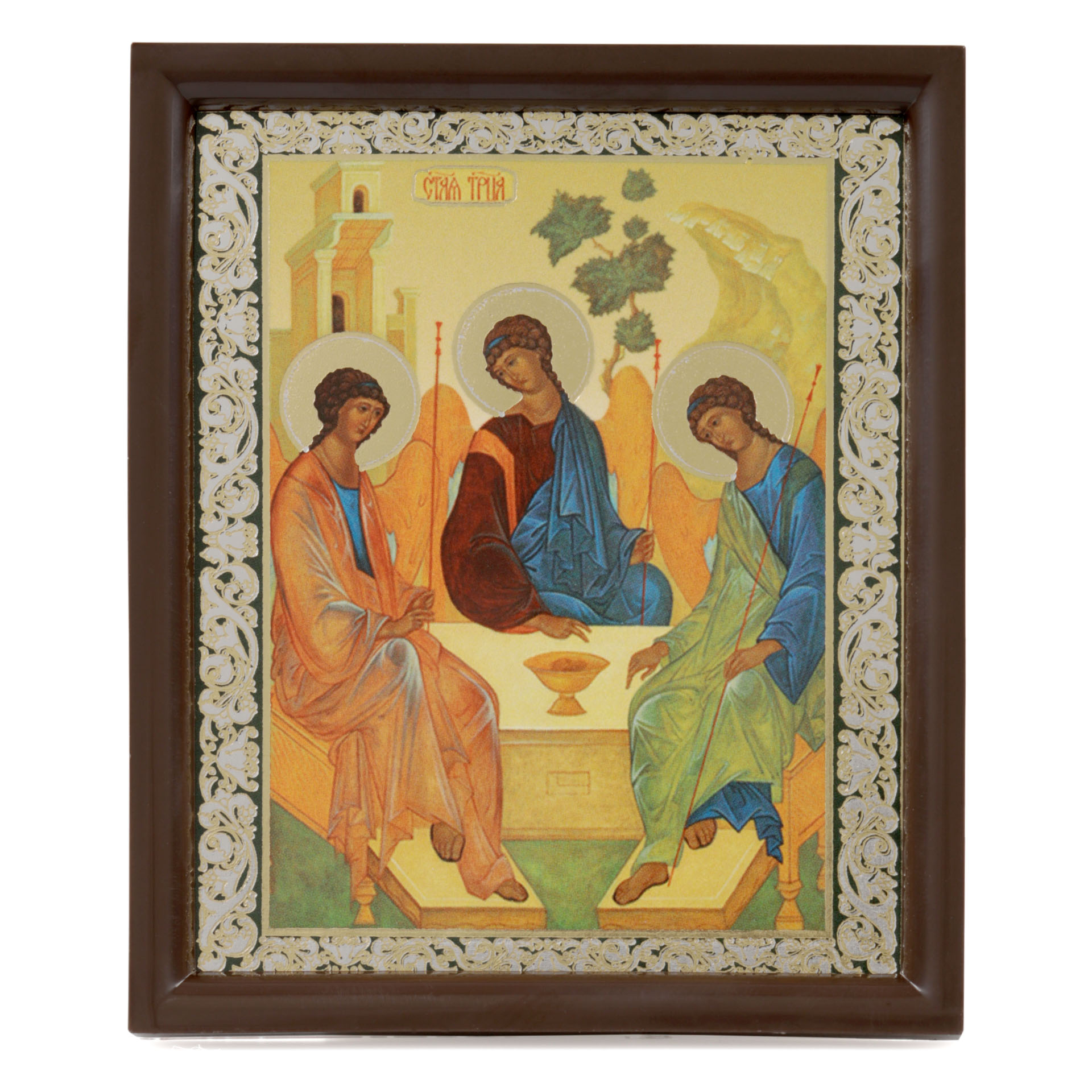 Икона на оргалите 6х9 двойное тиснение, рамка пластмассовая, упаковка Троица (Рублевская)