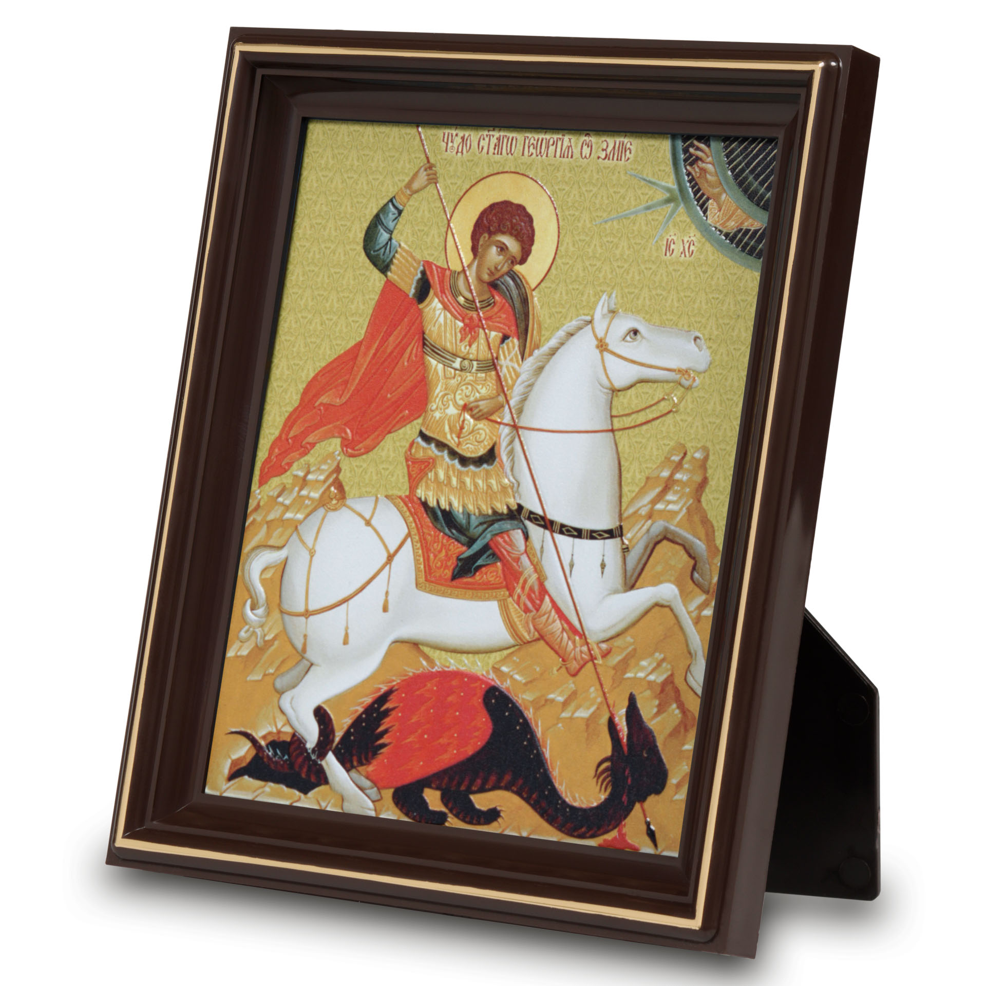 Икона на пластике 13х16 объёмная печать, лак, в пластмассовой рамке на подставке Чудо Георгия о змие №1