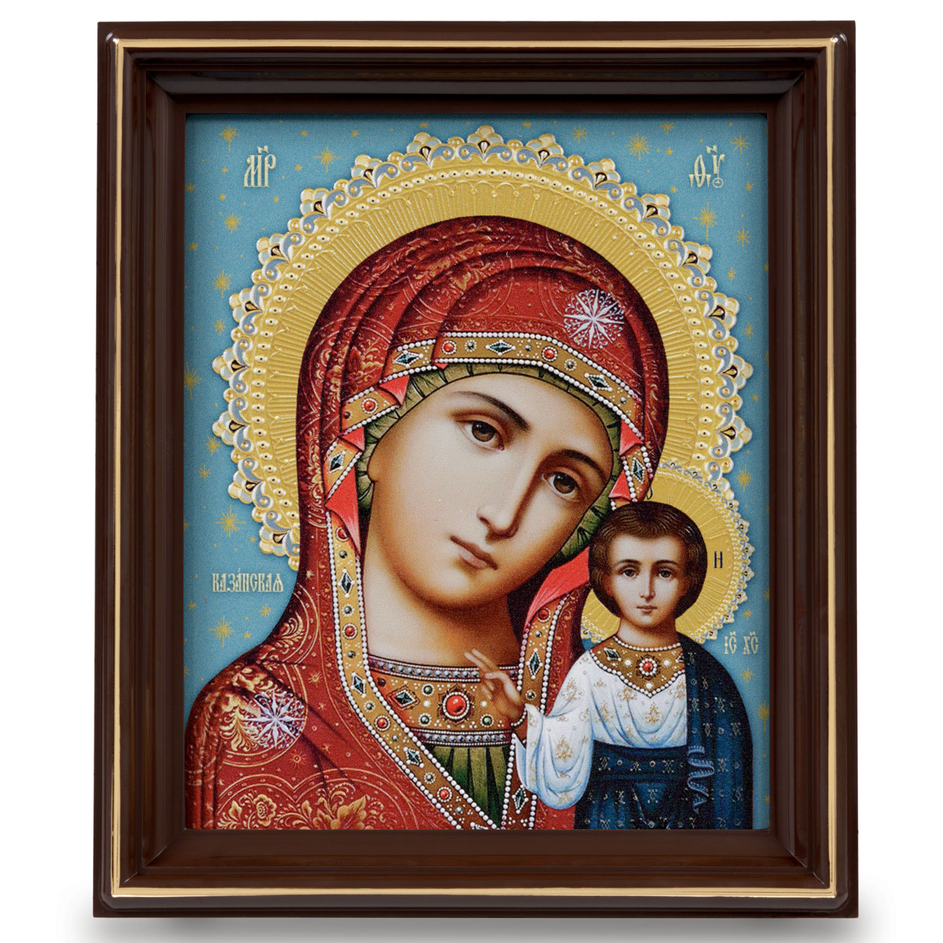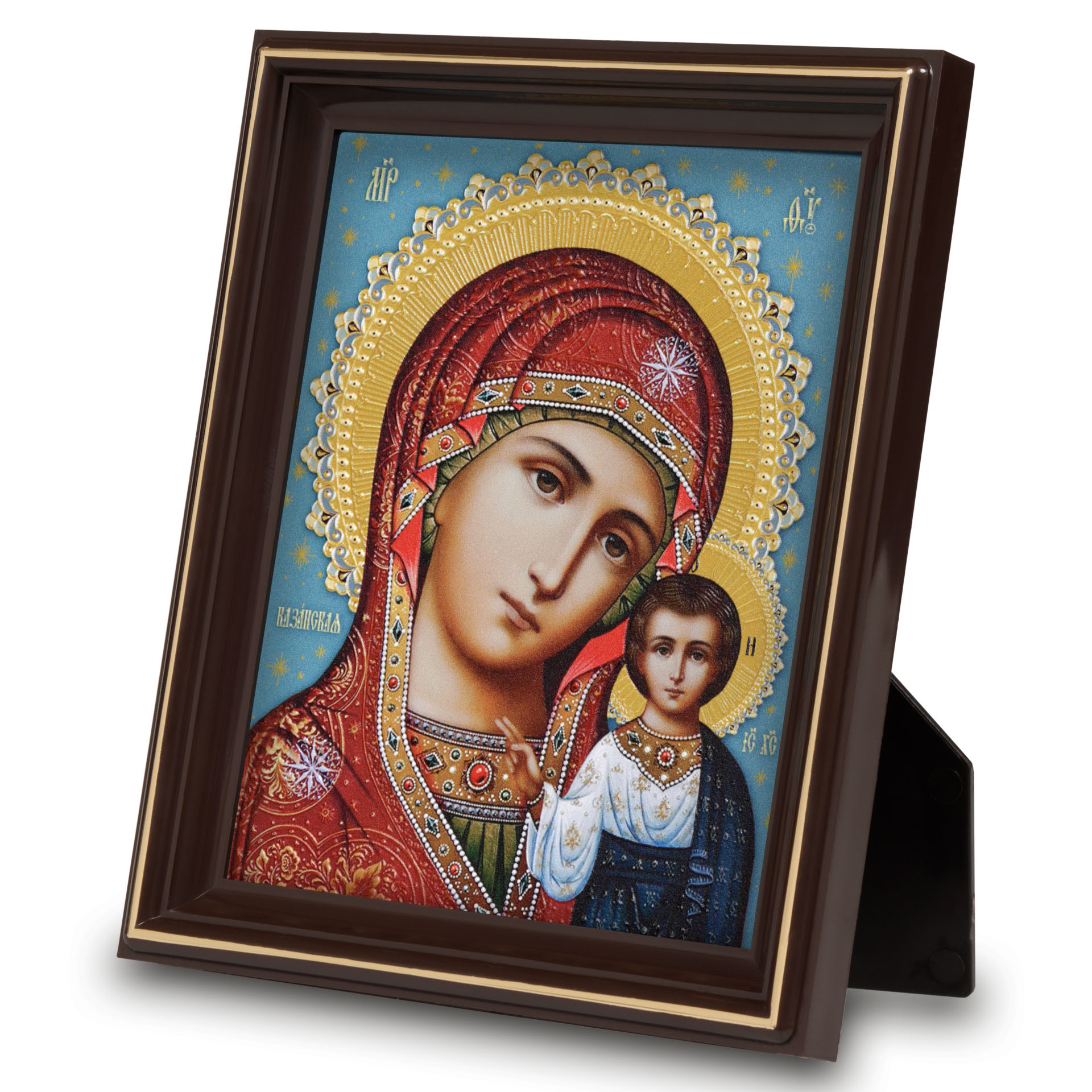 Икона на пластике 13х16 объёмная печать, лак, в пластмассовой рамке на подставке Казанская БМ 1