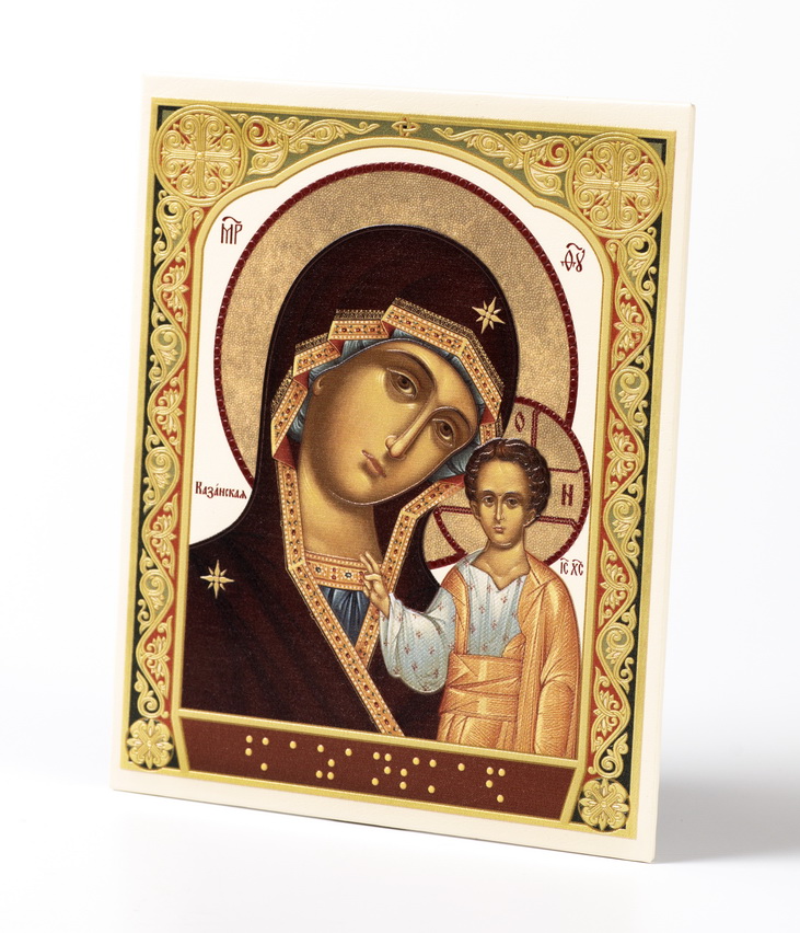 Икона настольная 11х13 на подставке, объемная печать (для людей с нарушением зрения) Казанская БМ