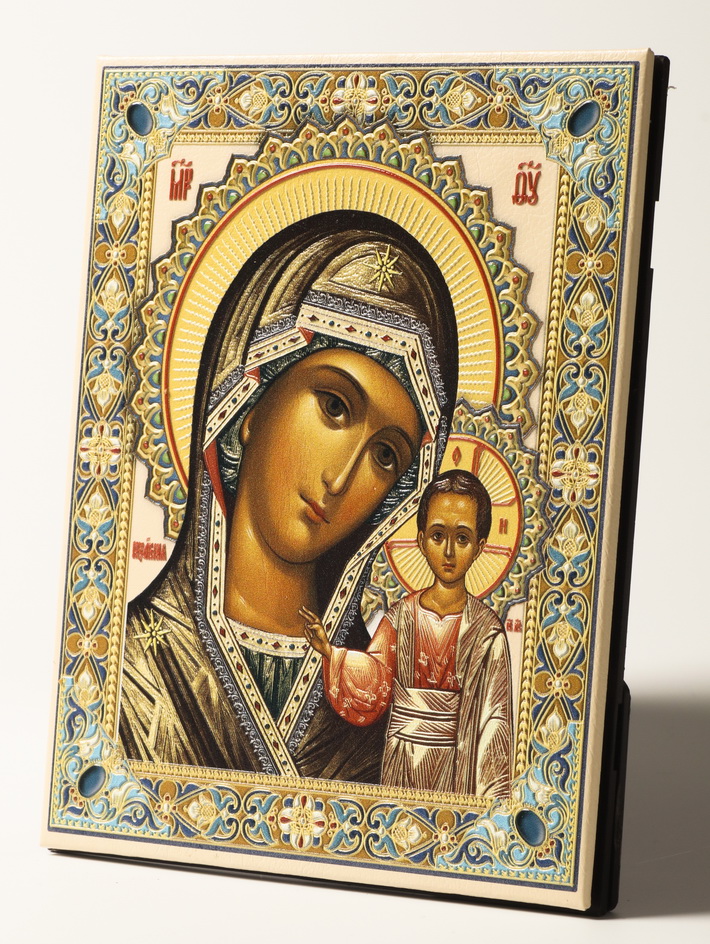 Иконы настольные на подставке изготовлены с использованием техники объёмной печати на коже. Для производства икон применяются только высококачественные материалы, яркие, насыщенные краски. Используется современное оборудование – УФ плоттер Mimaki. По Вашему заказу мы можем напечатать любой лик.