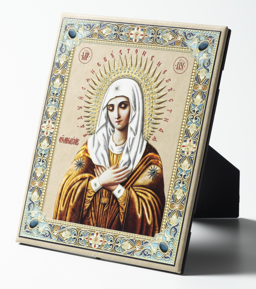 Иконы настольные на подставке изготовлены с использованием техники объёмной печати на коже. Для производства икон применяются только высококачественные материалы, яркие, насыщенные краски. Используется современное оборудование – УФ плоттер Mimaki. По Вашему заказу мы можем напечатать любой лик.