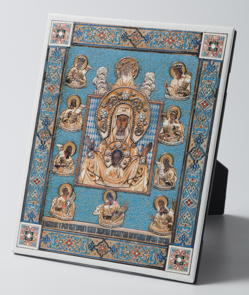 Иконы настольные на подставке изготовлены с использованием техники объёмной печати на коже. Для производства икон применяются только высококачественные материалы, яркие, насыщенные краски. Используется современное оборудование – УФ плоттер Mimaki. По Вашему заказу мы можем напечатать любой лик.