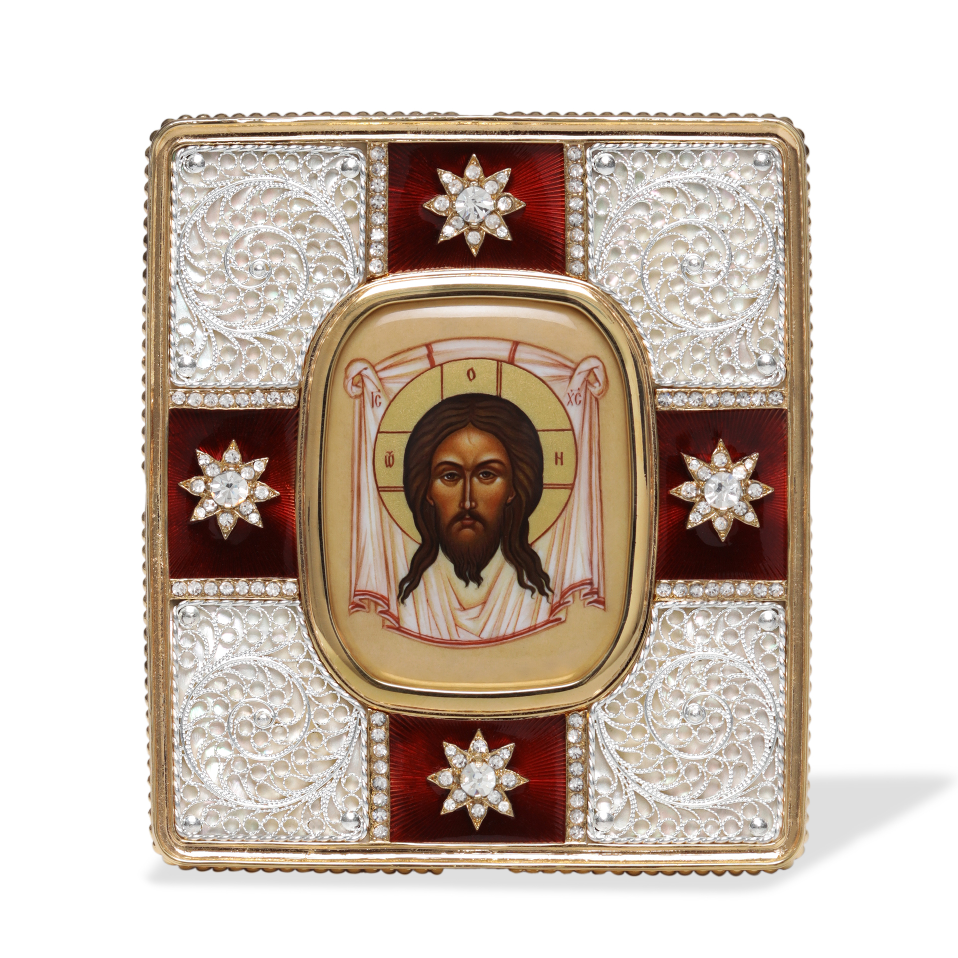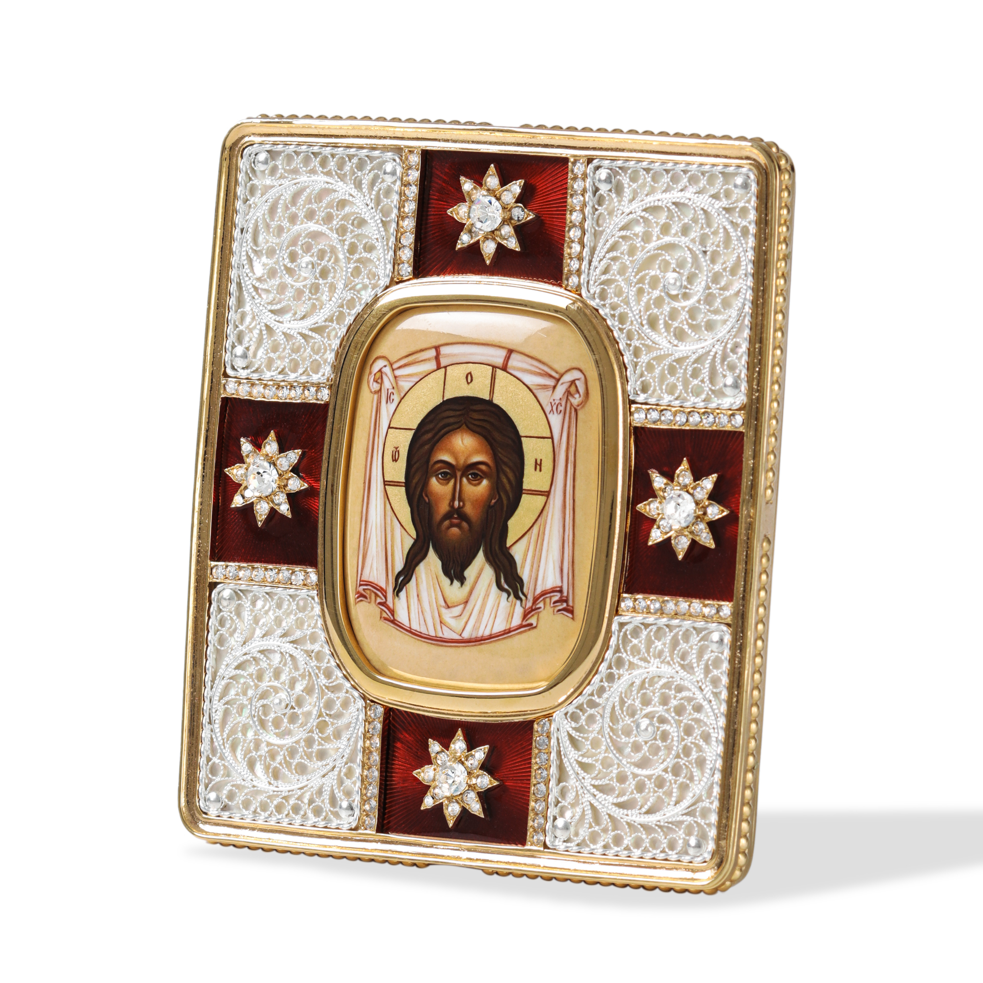 Икона настольная №122 деколь, филигрань, эмаль, перламутр / золочение, серебрение / Спас Нерукотворный