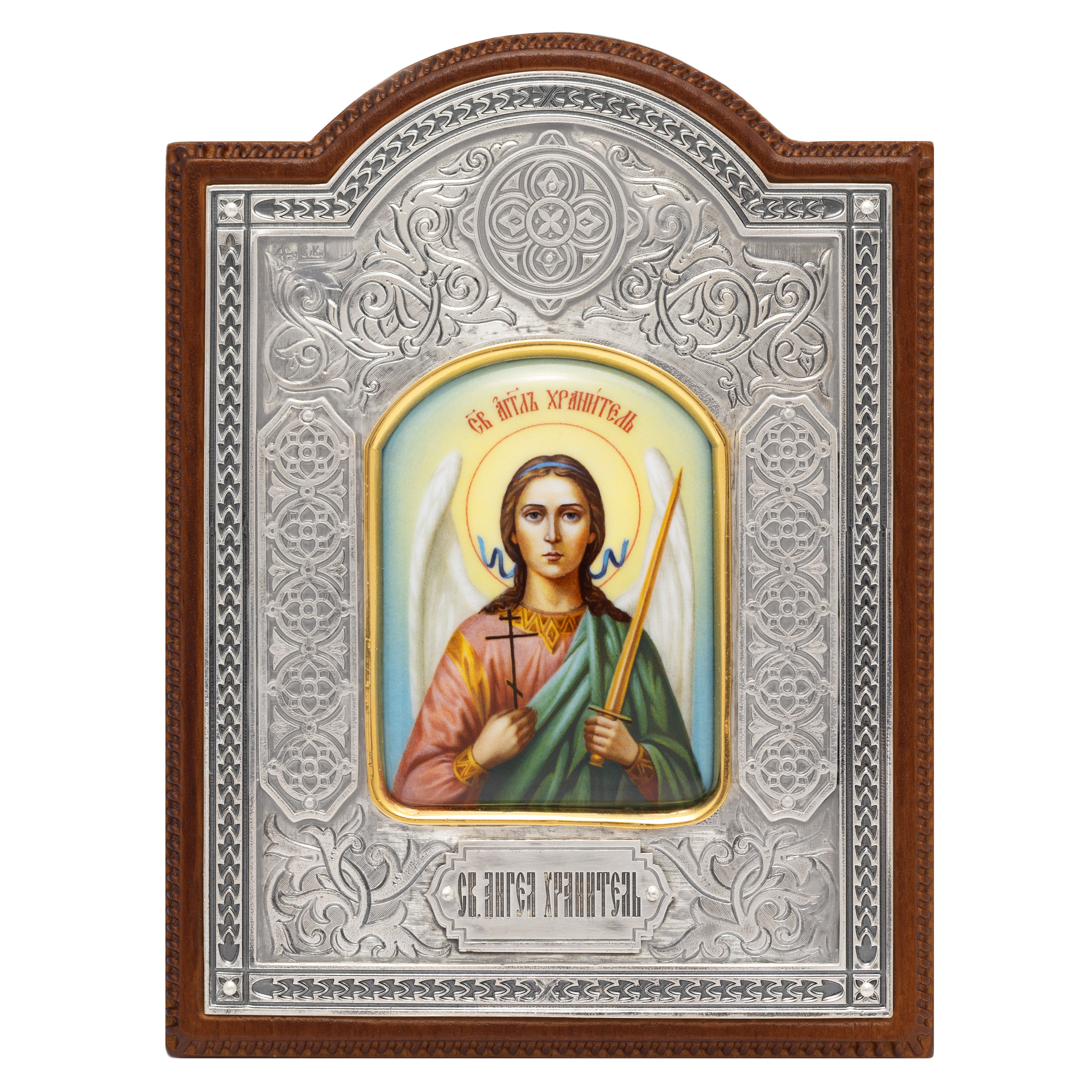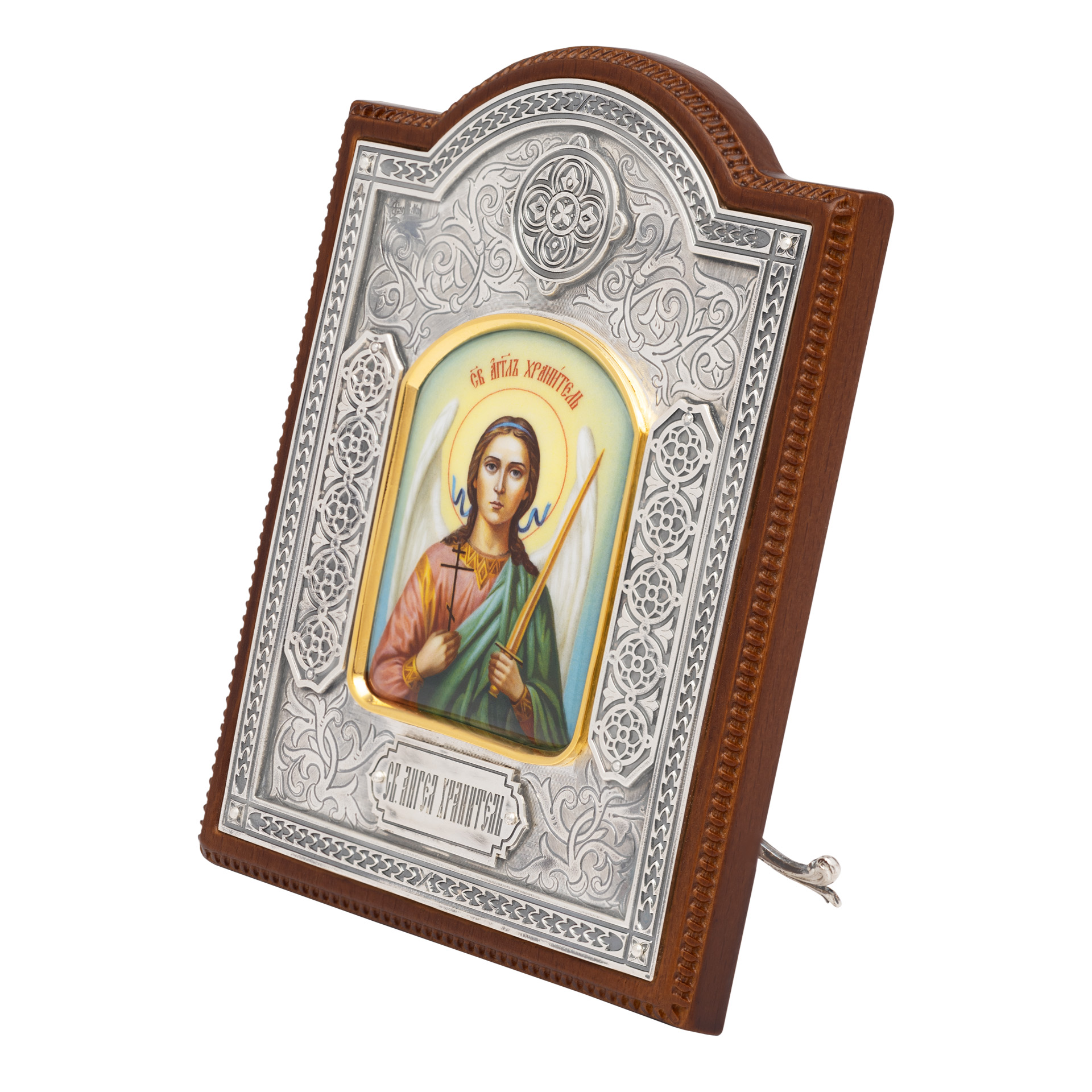 Икона настольная №146 гальванопластика, деколь в деревянной рамке / золочение, серебрение / Ангел Хранитель