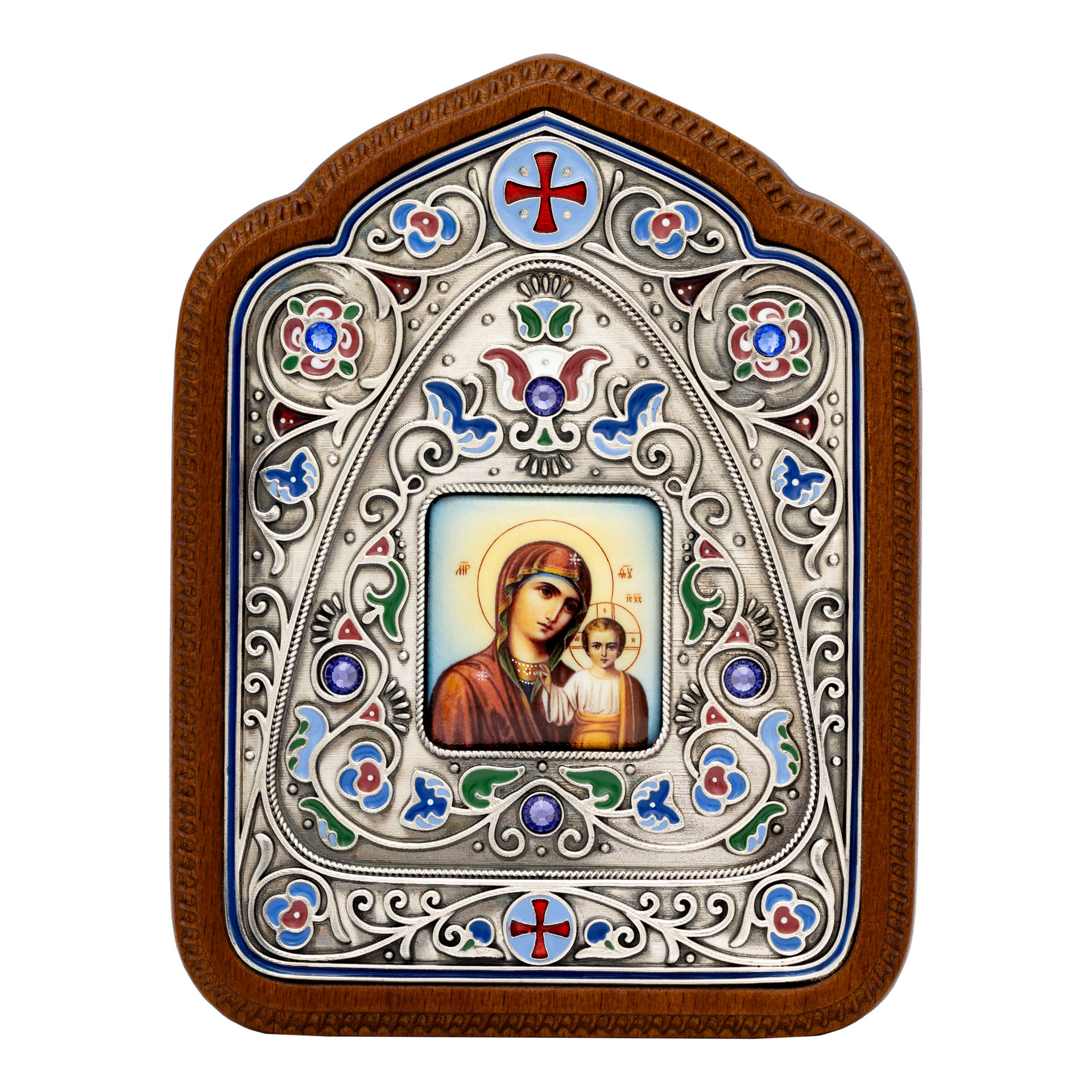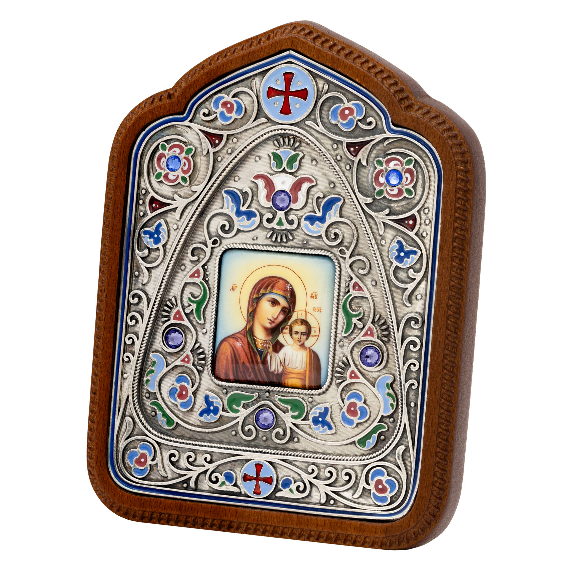 Икона настольная №156 гальванопластика, эмаль, деколь, в деревянной рамке / серебрение / Казанская БМ