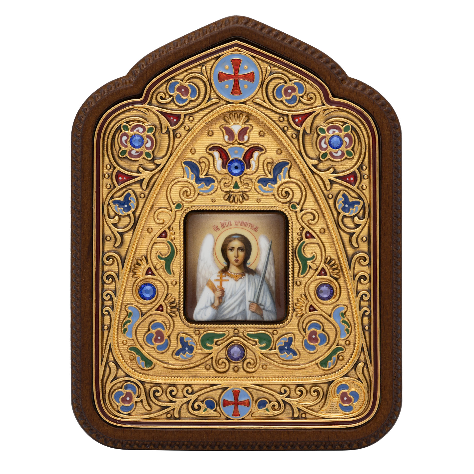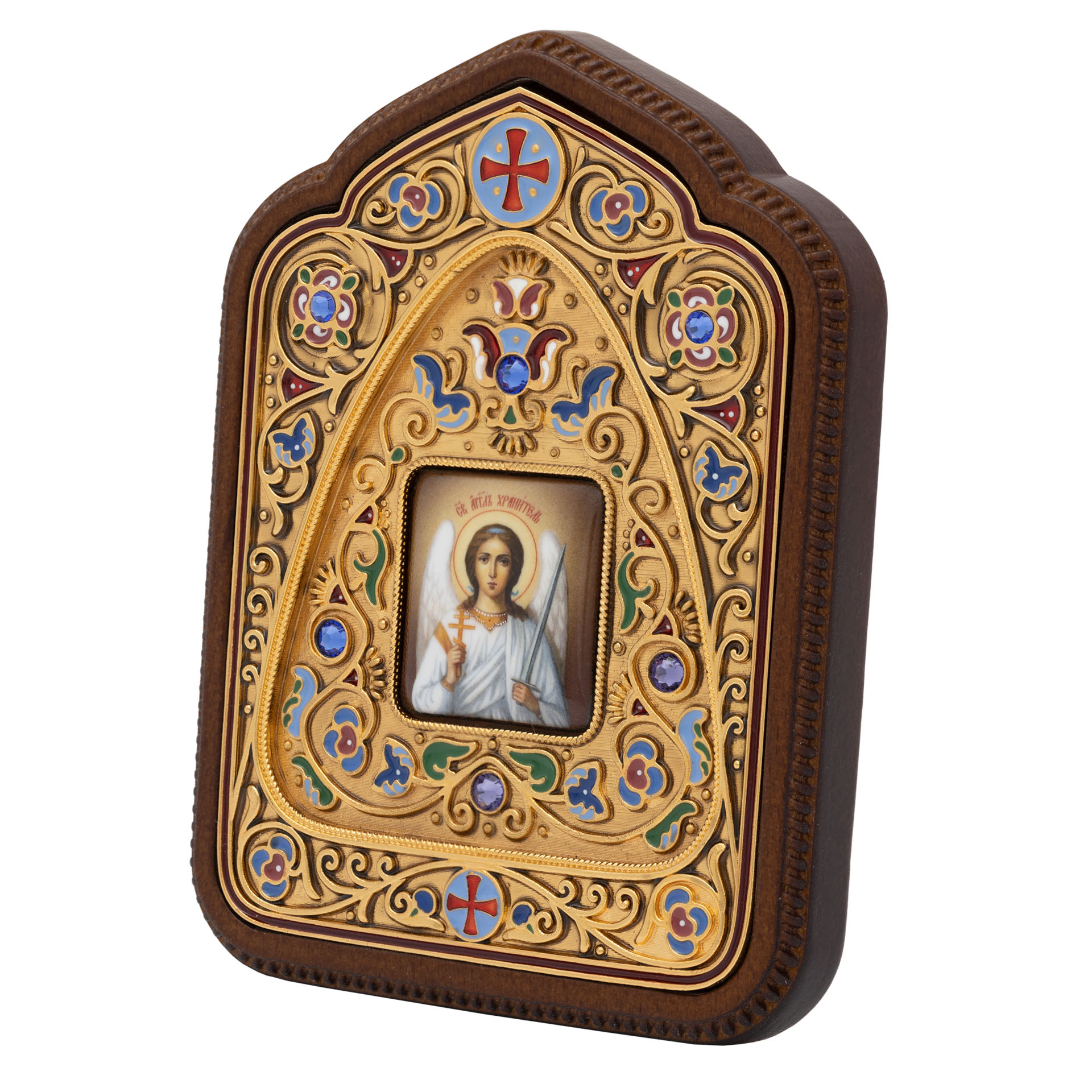 Икона настольная №156 гальванопластика, эмаль, деколь, в деревянной рамке / золочение / Ангел Хранитель