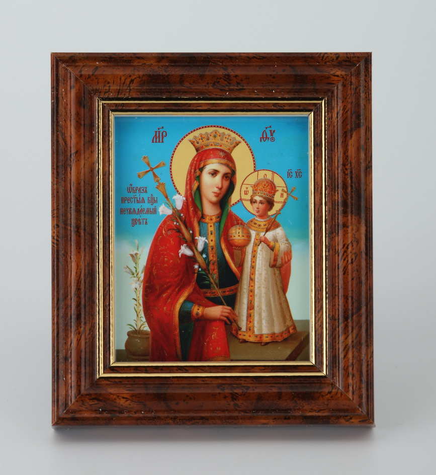 На иконе «Неувядаемый цвет» изображена Божья Матерь, держащая в руках младенца Христа и белую лилию. Этот светлый цветок – символ чистоты и непорочности Девы Марии. Само название иконы взято из Акафиста, в котором Пречистая Дева названа «корнем девства и неувядаемым цветом чистоты».