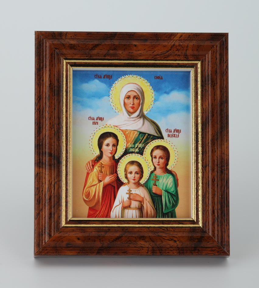 Святые мученицы Вера, Надежда, Любовь и их матерь София жили в Риме во II веке. Святым сестрам было всего двенадцать, десять и девять лет, когда император Адриан позвал их в свой дворец для поклонения богине Диане. Не смотря на свой юный возраст, святые отказались принести языческую жертву и, претерпев страшные мучения, предали души Богу. София похоронила дочерей и через три дня отправилась к ним в вечность.