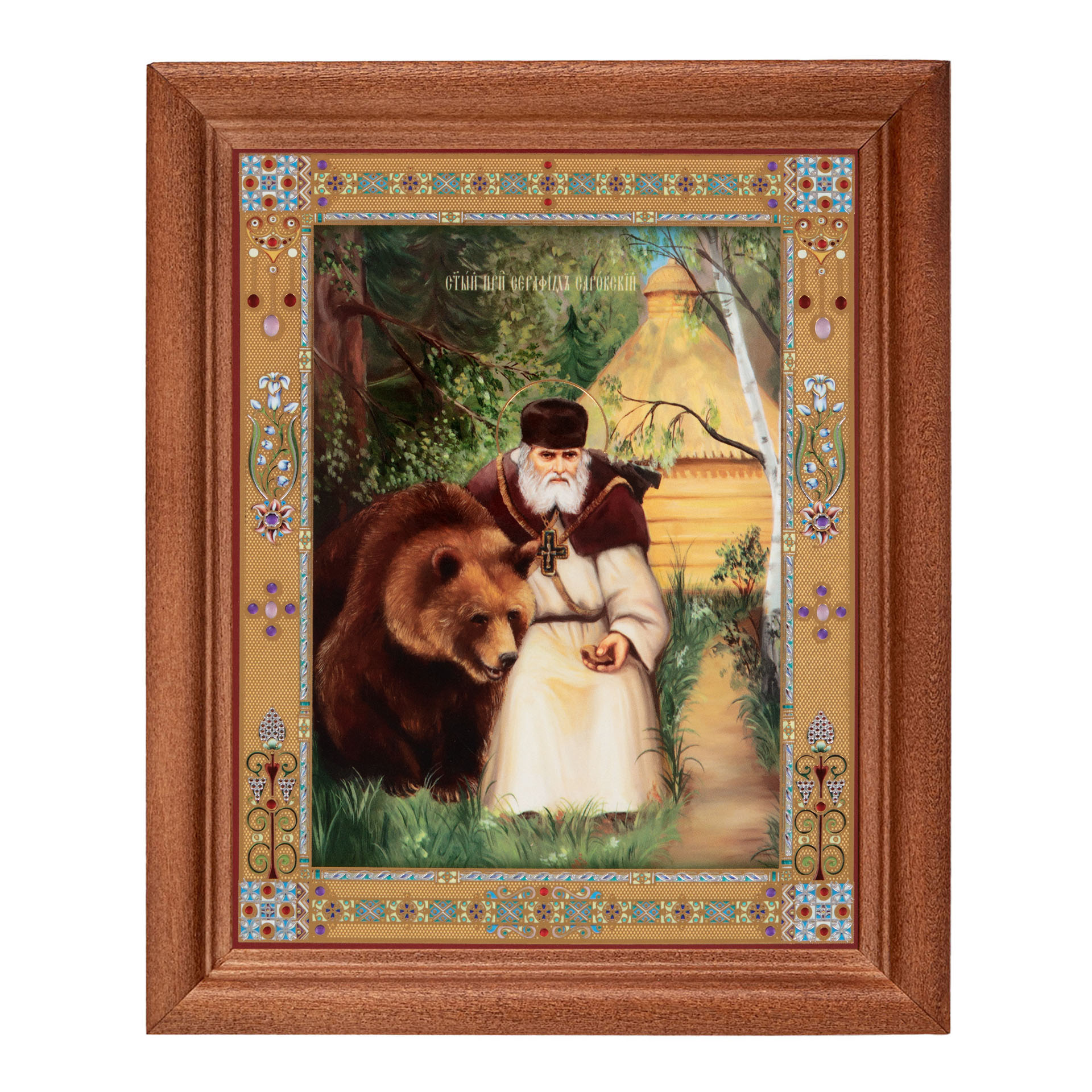 Икона в деревянной рамке №1 11х13 двойное тиснение Серафим Саровский с медведем 3