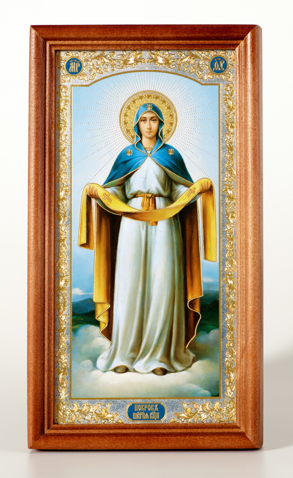 Икона в деревянной рамке №1 11х22 двойное тиснение Покров (ростовой) 2