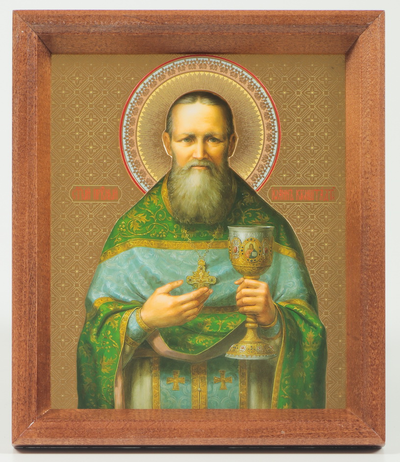 Икона в деревянной рамке №1 13х15 тиснение с венчиком Иоанн Кронштадтский