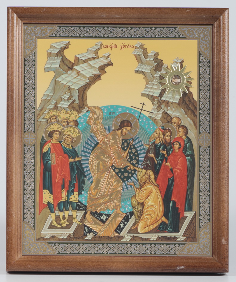 Икона в деревянной рамке №1 18х24 двойное тиснение, БЗГ, мощевик-звезда, упаковка Воскресение Христово