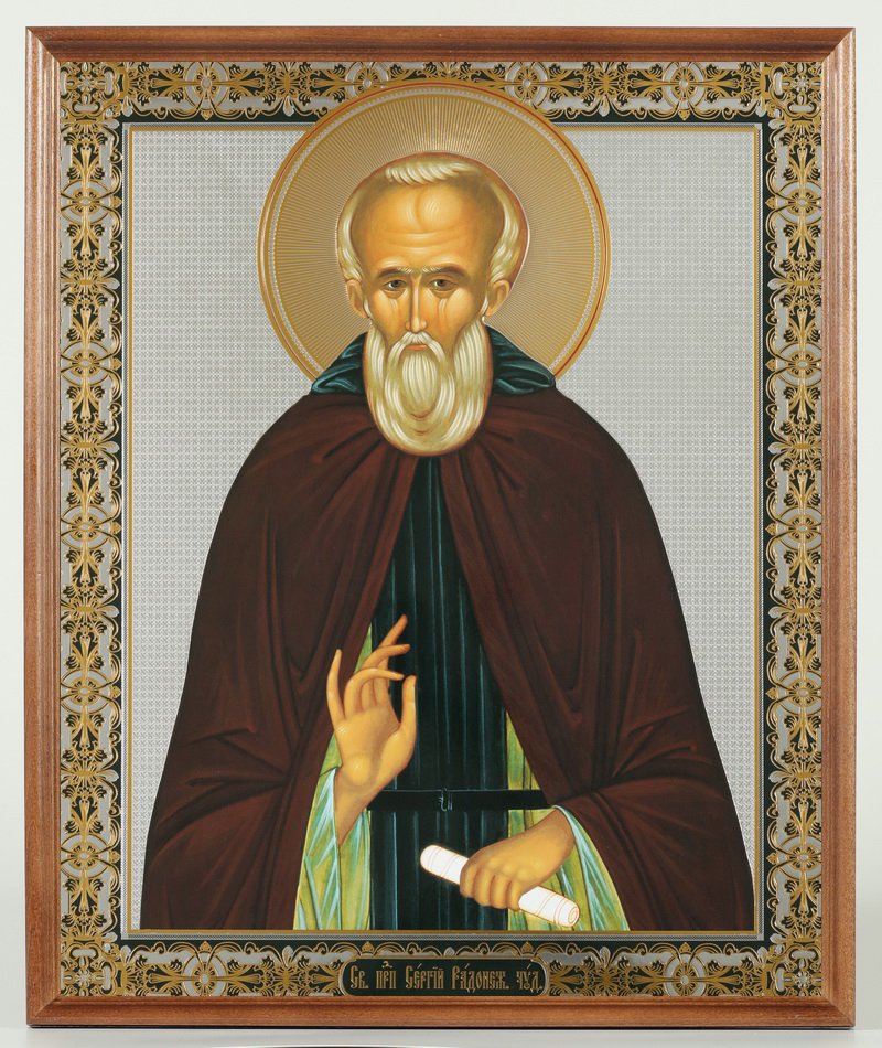 Икона в деревянной рамке №1 30х40 двойное тиснение, упаковка Сергий Радонежский