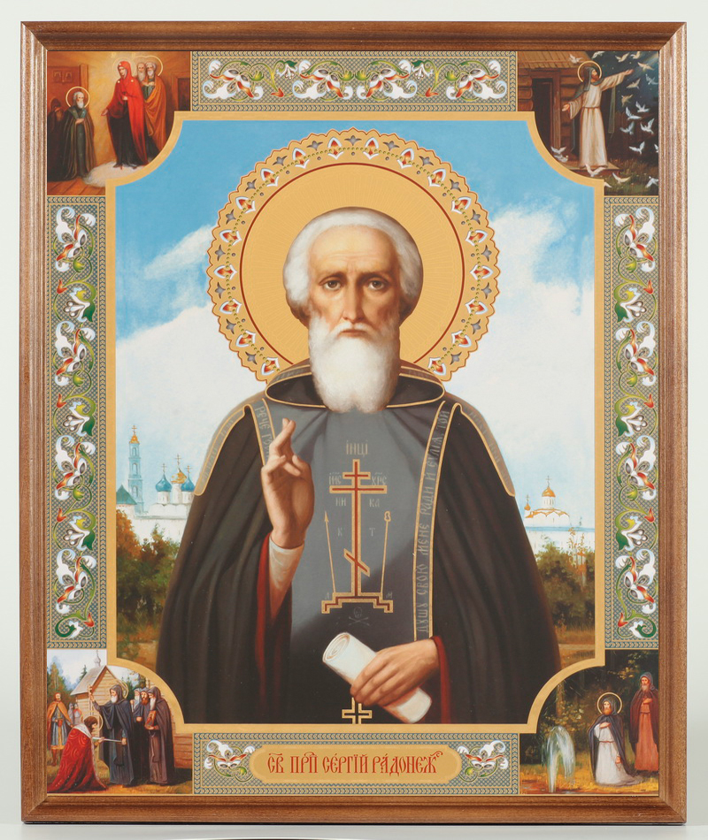 Икона в деревянной рамке №1 30х40 тиснение, упаковка Сергий Радонежский (с клеймами)