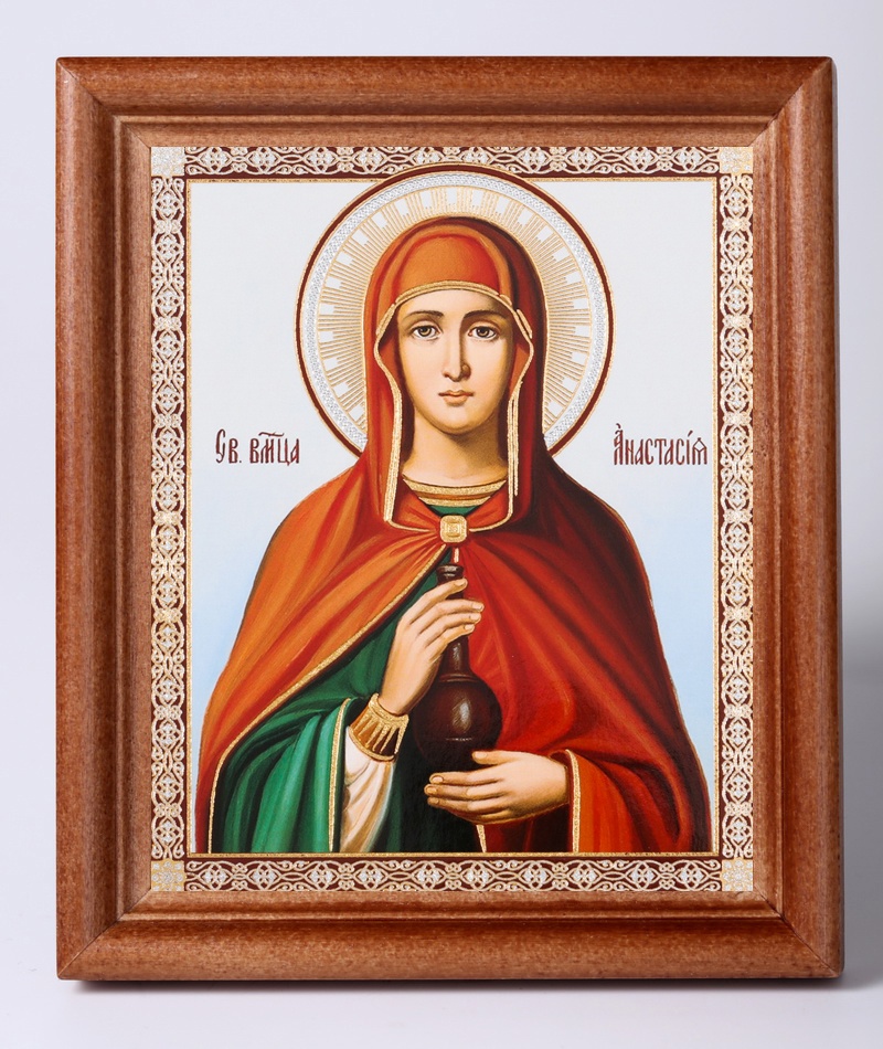 Икона в деревянной рамке 11х13 Набор с Днем Ангела, двойное тиснение Анастасия Узорешительница, св., вмц. (2)