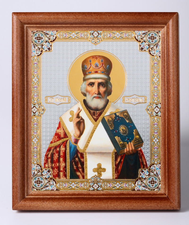 Икона в деревянной рамке 11х13 Набор с Днем Ангела, двойное тиснение Николай Чудотворец 14