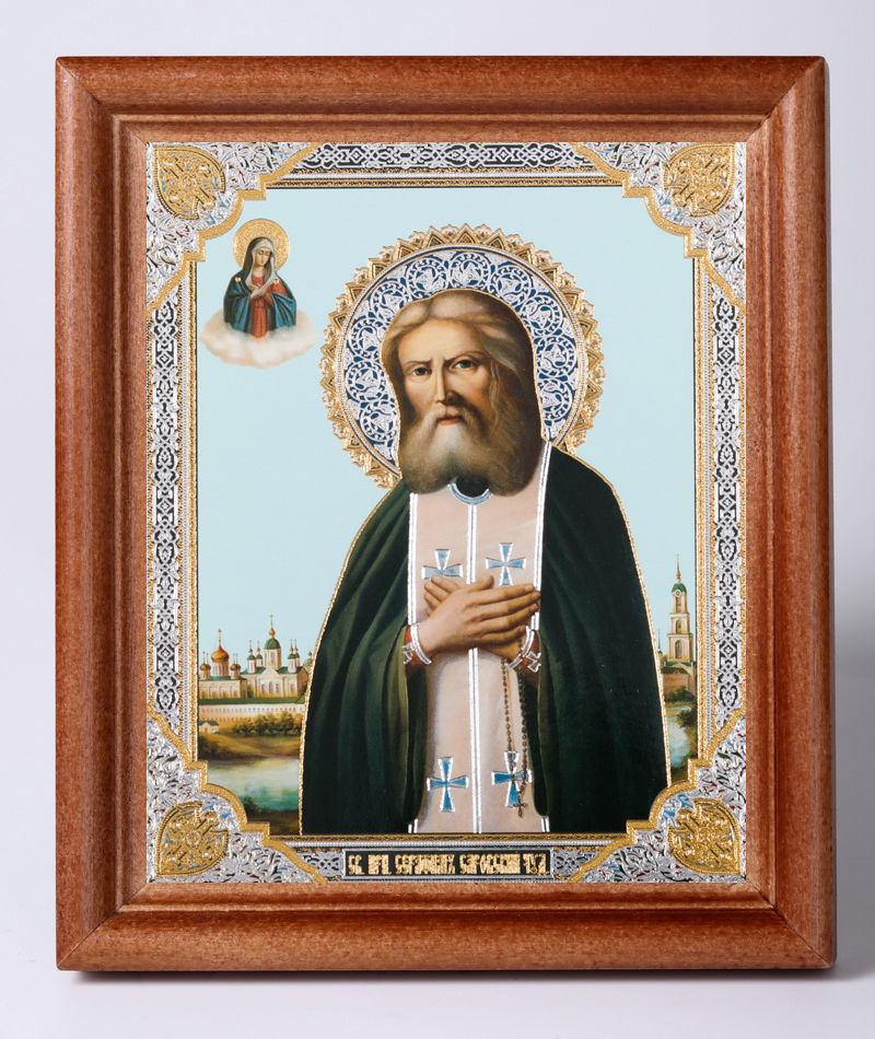 Икона в деревянной рамке 11х13 Набор с Днем Ангела, двойное тиснение Серафим Саровский 2