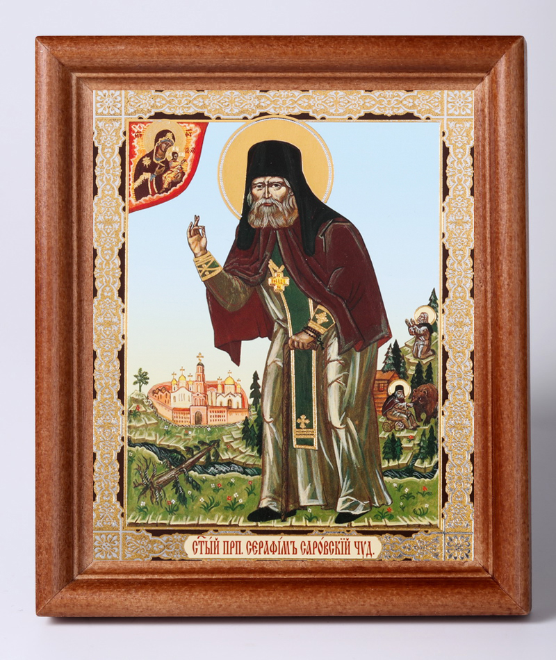 Икона в деревянной рамке 11х13 Набор с Днем Ангела, двойное тиснение Серафим Саровский (ростовой) 3