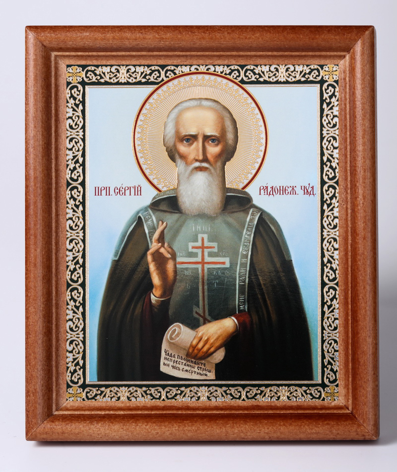 Икона в деревянной рамке 11х13 Набор с Днем Ангела, двойное тиснение Сергий Радонежский 3