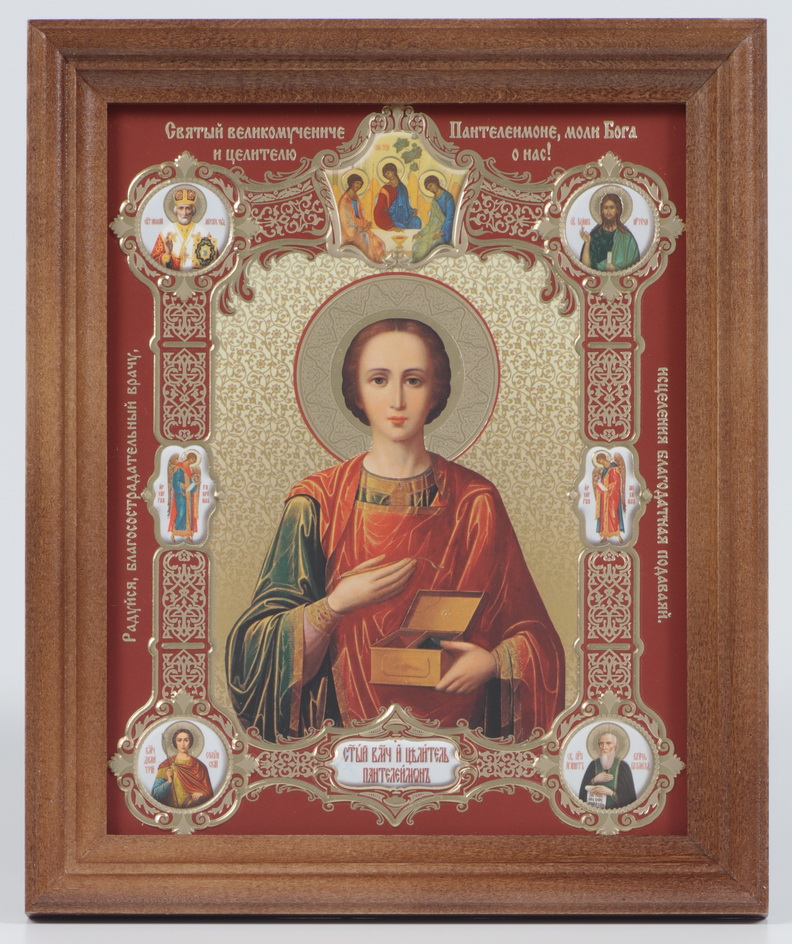 Икона в деревянной рамке 13х18 конгрев, плёнка (без стекла) Пантелеимон (с клеймами)