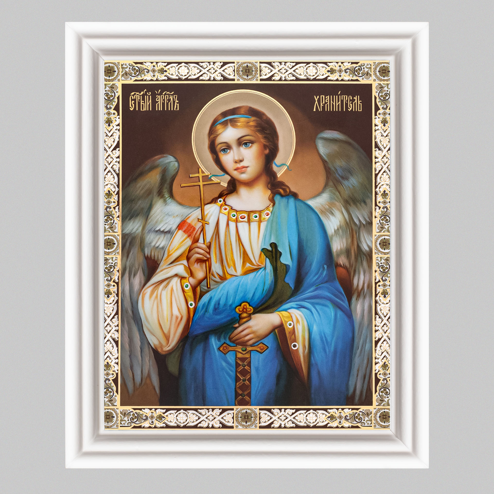 Икона в деревянной рамке №3 11х13 (белая) двойное тиснение Ангел-Хранитель (поясной) №8