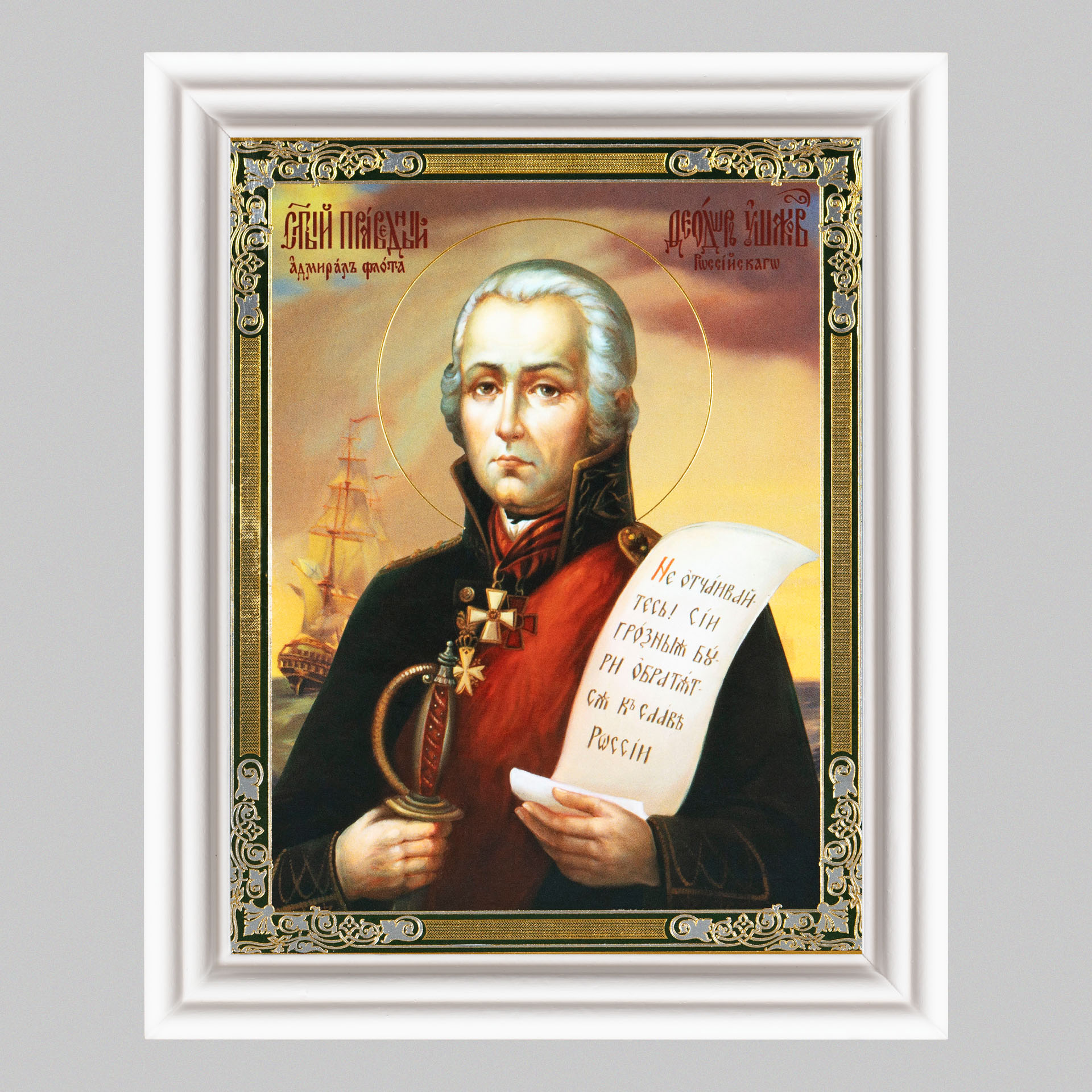 Икона в деревянной рамке №3 11х13 (белая) двойное тиснение Феодор Ушаков 3