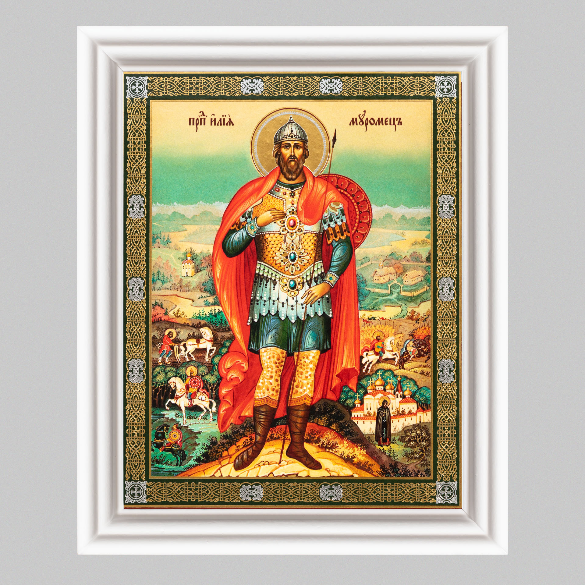 Икона в деревянной рамке №3 11х13 (белая) двойное тиснение Илия Муромец 2