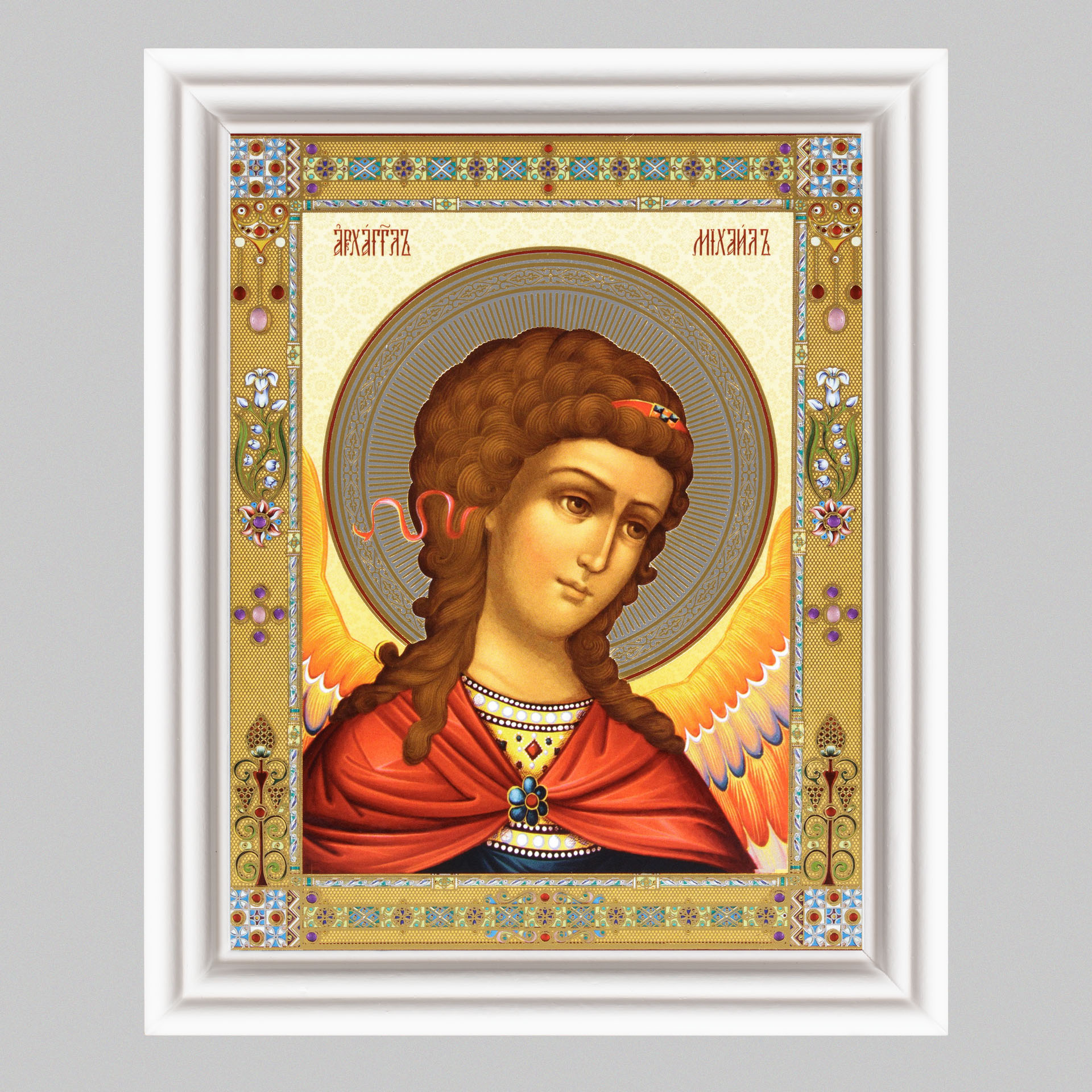 Икона в деревянной рамке №3 11х13 (белая) двойное тиснение Михаил Архангел (оплечный)