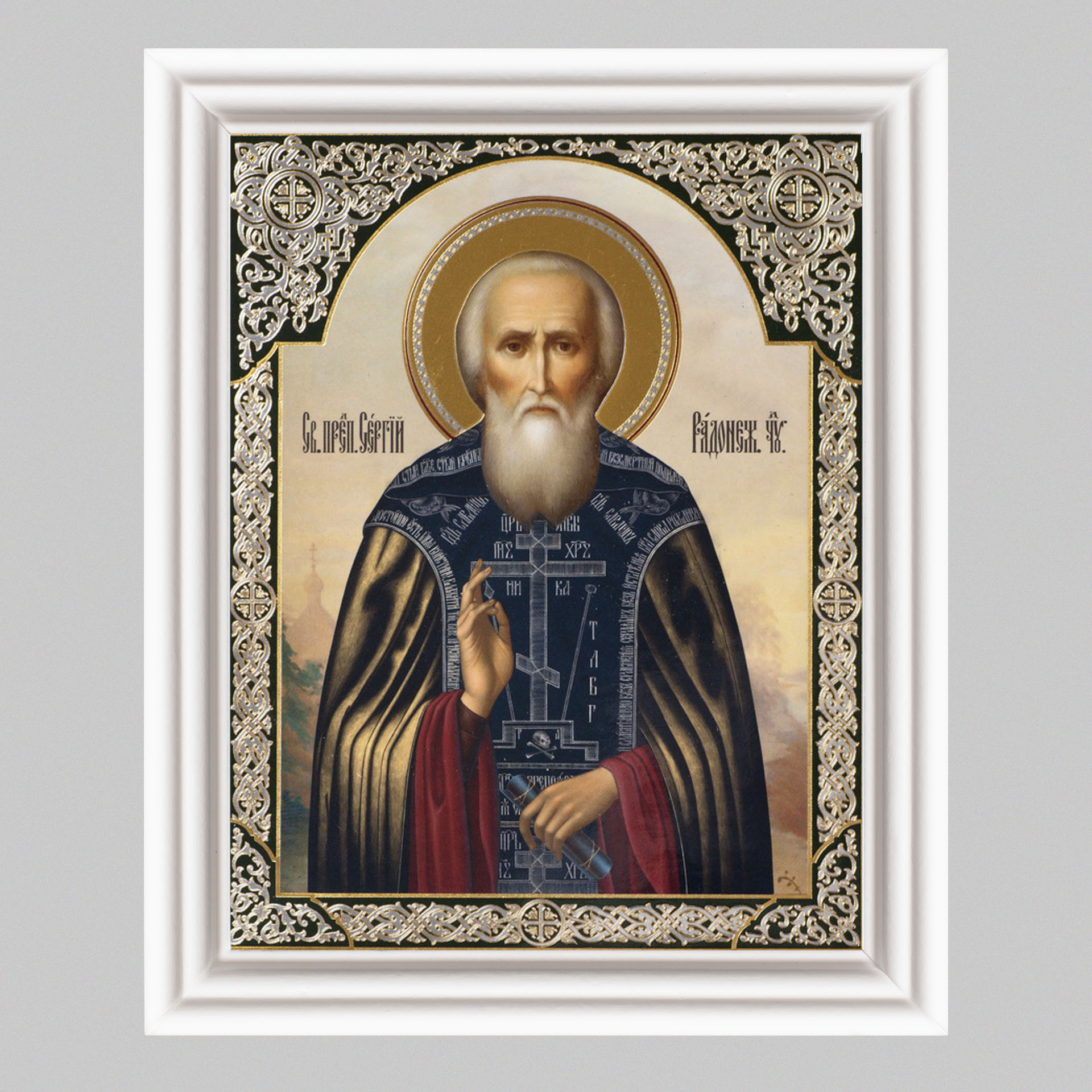 Икона в деревянной рамке №3 11х13 (белая) двойное тиснение Сергий Радонежский 22