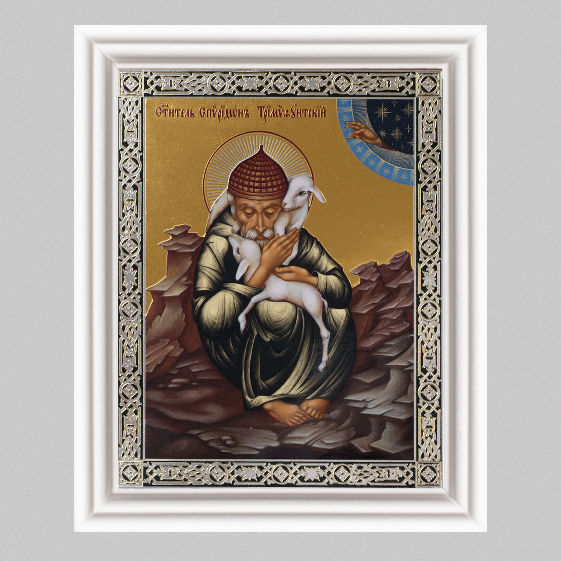 Икона в деревянной рамке №3 11х13 (белая) двойное тиснение Спиридон Тримифунтский 7
