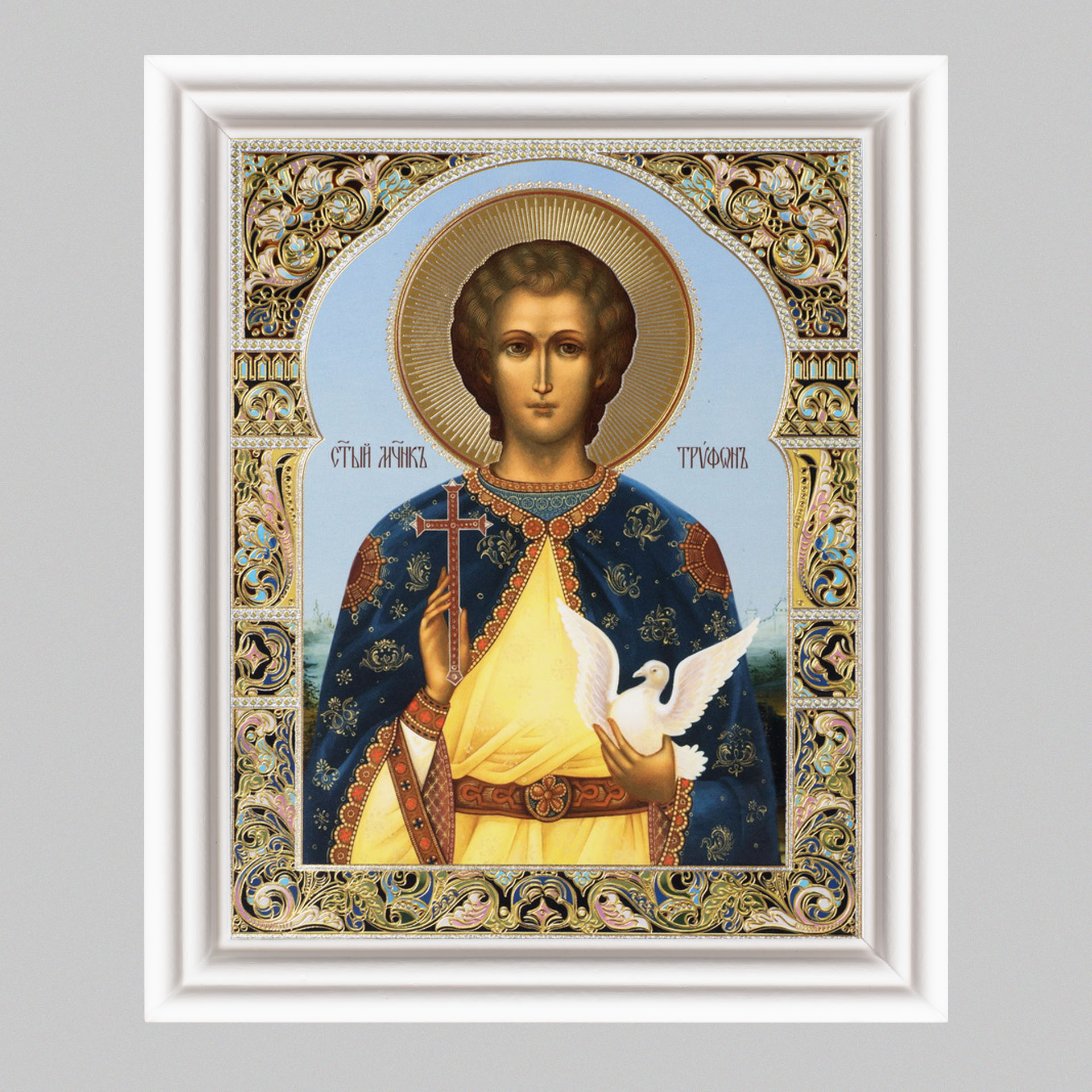 Икона в деревянной рамке №3 11х13 (белая) двойное тиснение Трифон 3
