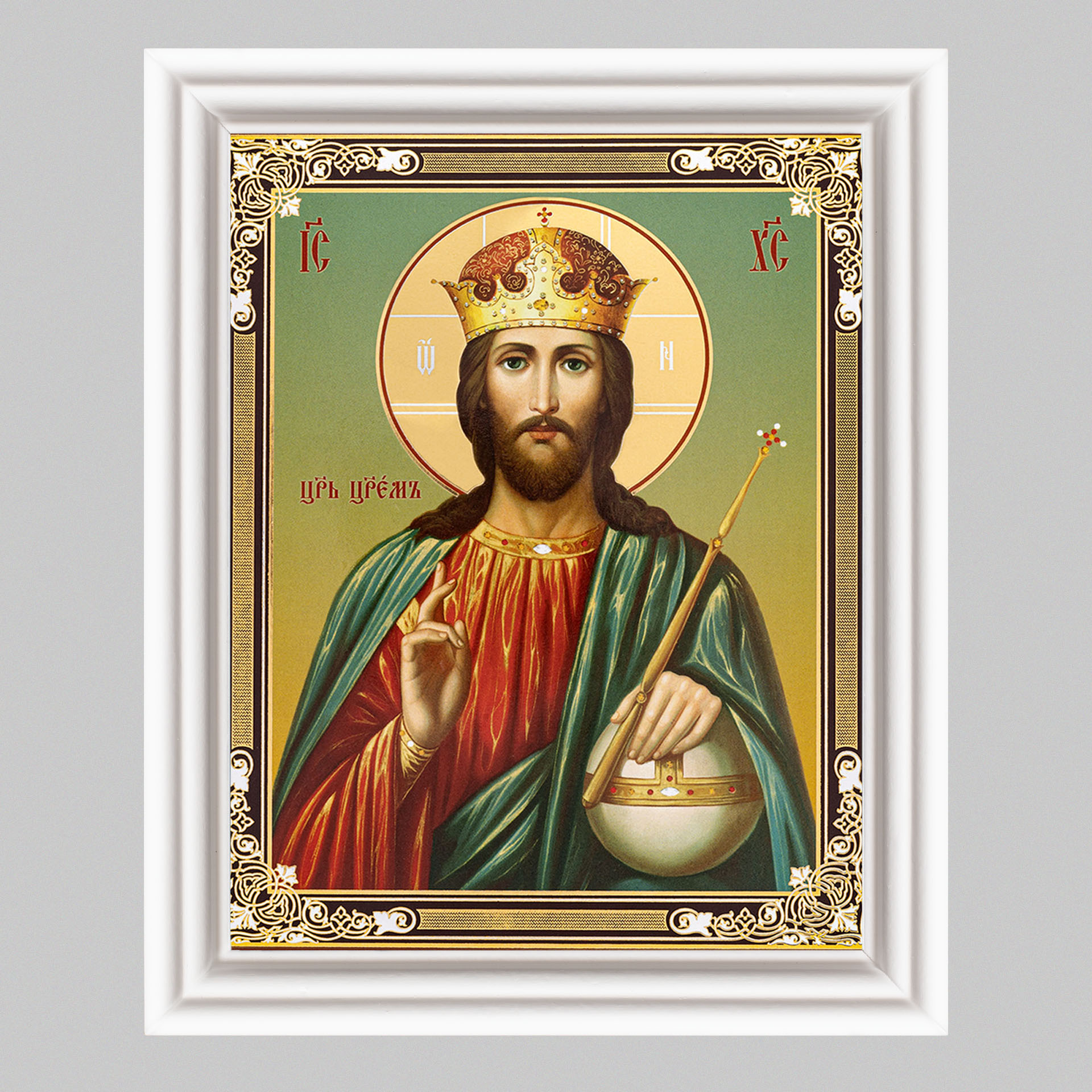 Икона в деревянной рамке №3 11х13 (белая) двойное тиснение Царь Царем (Царь Царей)