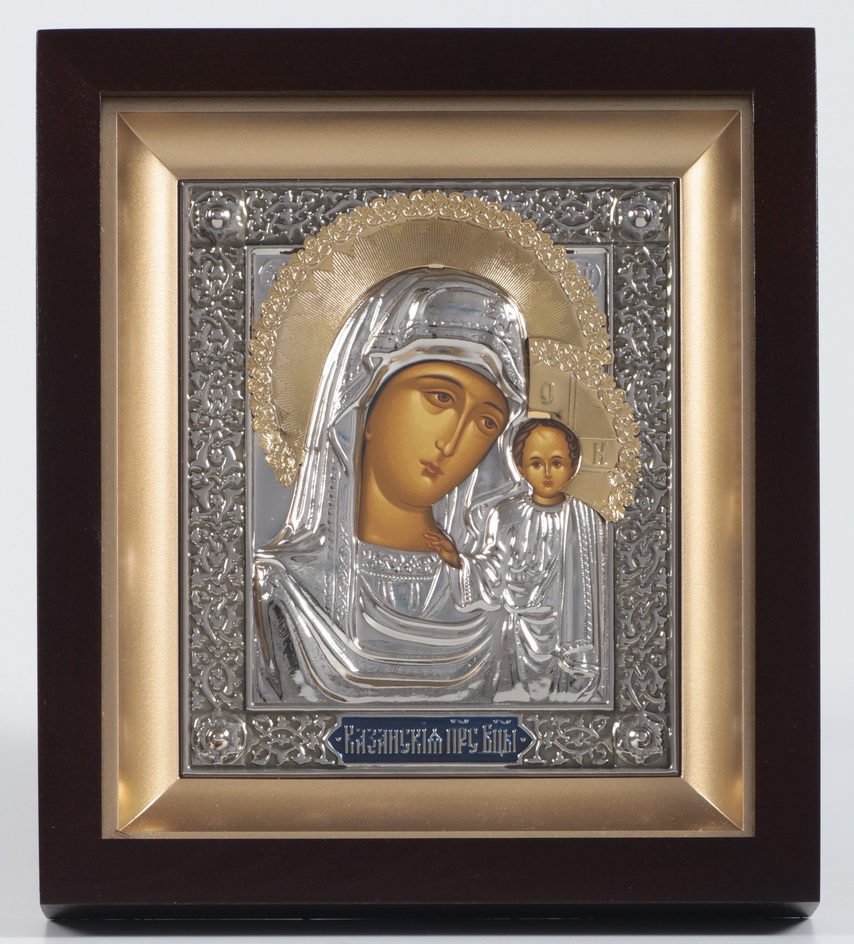 Икона в киоте 11х13 фигурный №2 темпера, пластмассовый подрамник, риза никель, эмаль, золоч Казанская БМ