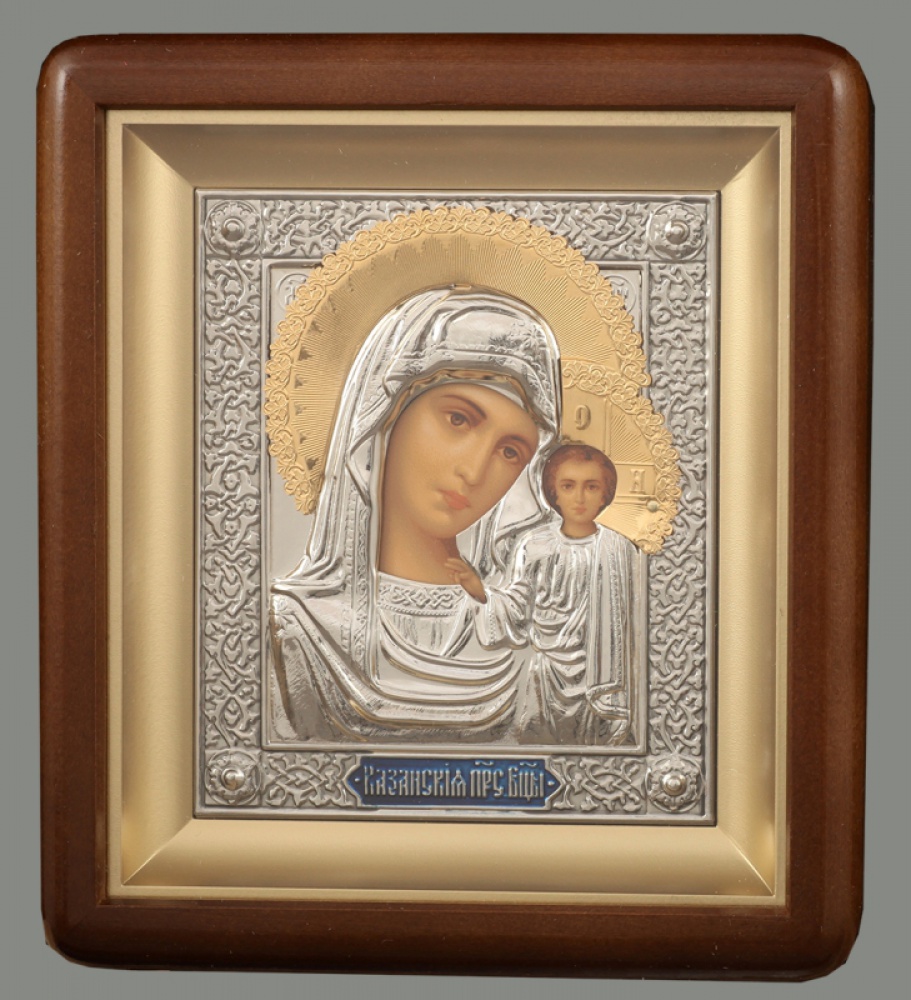 Икона в киоте 11х13 фигурный, темпера, риза, никель, эмаль Казанская БМ 1