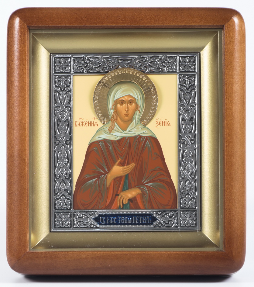 Икона в киоте 11х13 фигурный, темпера, риза, никель, эмаль Ксения Петербургская