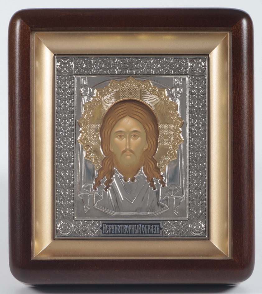 Икона в киоте 11х13 фигурный, темпера, риза, никель, эмаль Спас Нерукотворный