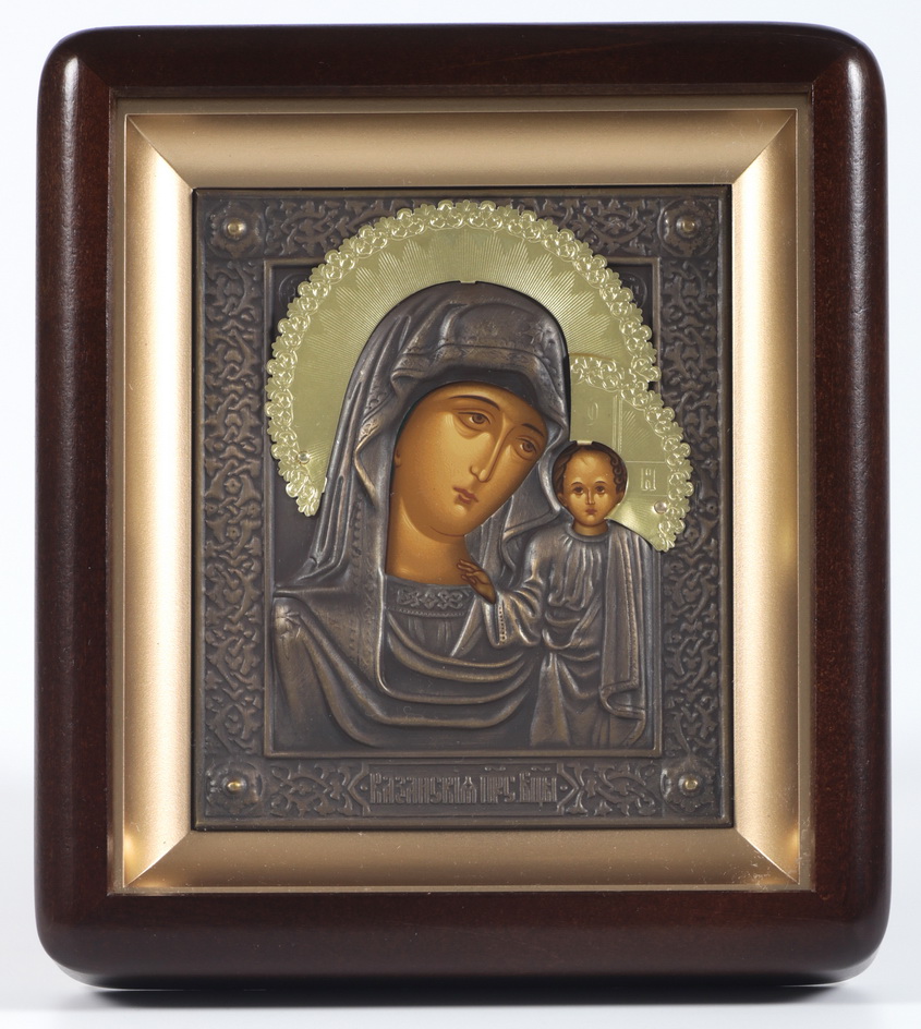 Икона в киоте 11х13 фигурный, темпера, риза патинированая Казанская БМ