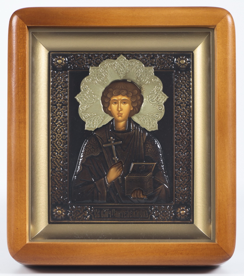 Икона в киоте 11х13 фигурный, темпера, риза патинированая Пантелеимон