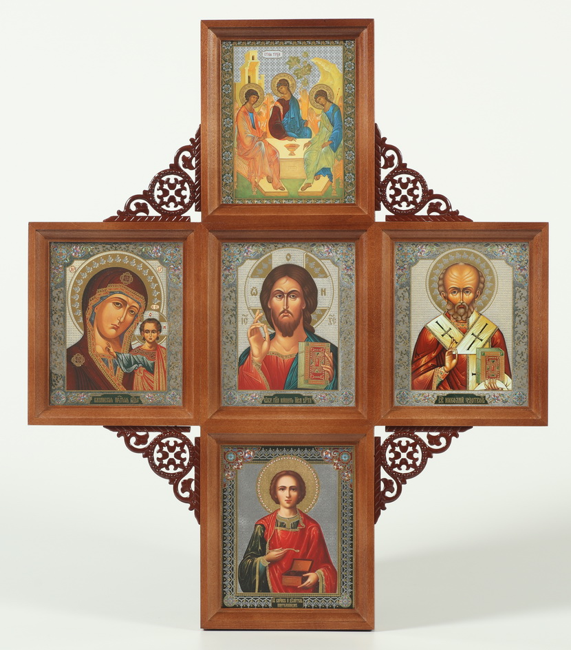 Икона в киоте 11х13 многоместная, двойное тиснение, 5 икон, резная
