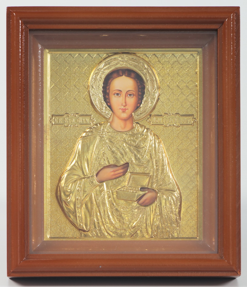 Икона в киоте 11х13 риза объемная Пантелеимон