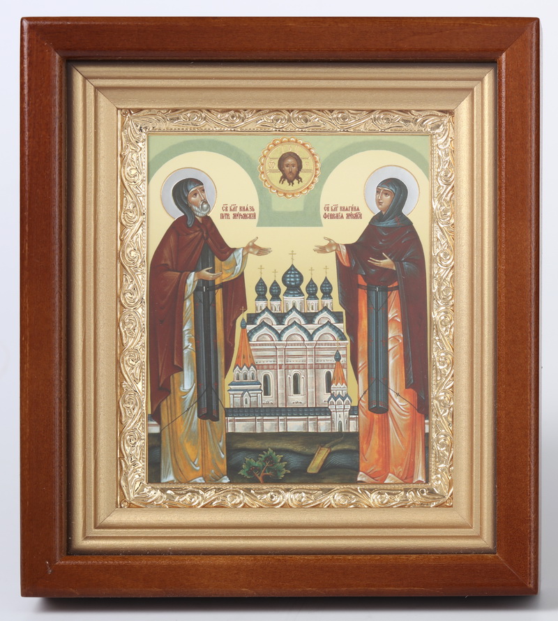 Икона в киоте 11х13 сложный, двойное тиснение, рамка золочёная Петр и Феврония 8