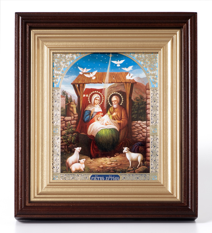 Икона в киоте 11х13 сложный, двойное тиснение Рождество Христово 35