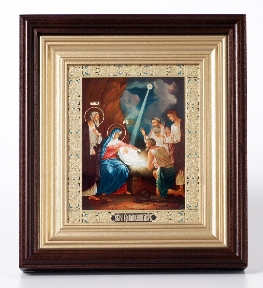 Икона в киоте 11х13 сложный, двойное тиснение Рождество Христово 64